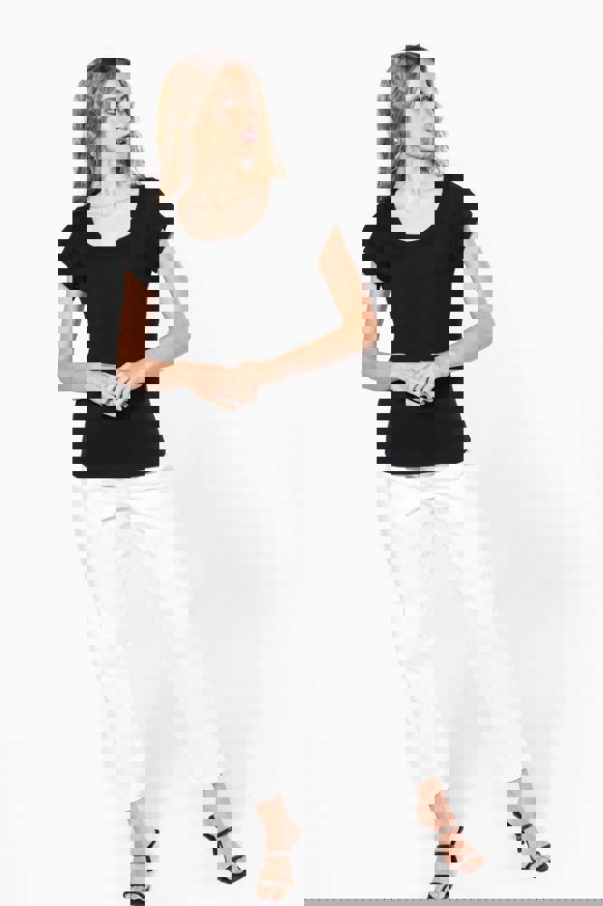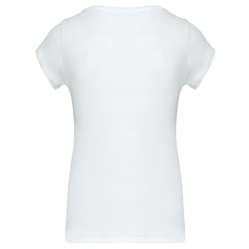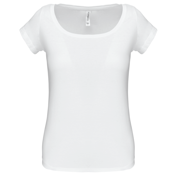 100% katoen. Enzym behandeld gekamd katoen. Wijde ronde boothals. Nektape (toon op toon voor White en Heather Grey voor de overige kleuren). Getailleerde snit. Afwerking met dubbele stiksels.