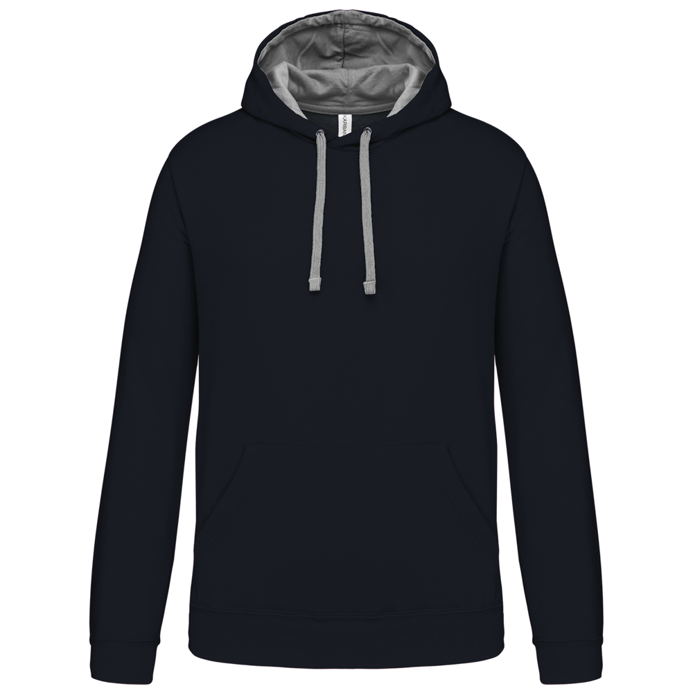 80% katoen / 20% polyester. Gekamd katoen. Geborsteld fleece aan de binnenkant. 'Kangaroe' zak aan de voorkant met gaatje voor draadje en lusje aan de kraag voor mp3-oortjes. Afwerking in ribboord. Gevoerde en gecontrasteerde capuchon met aanrijgkoordjes.