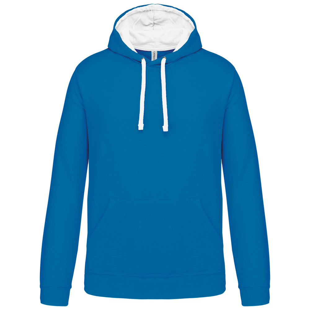 80% katoen / 20% polyester. Gekamd katoen. Geborsteld fleece aan de binnenkant. 'Kangaroe' zak aan de voorkant met gaatje voor draadje en lusje aan de kraag voor mp3-oortjes. Afwerking in ribboord. Gevoerde en gecontrasteerde capuchon met aanrijgkoordjes.