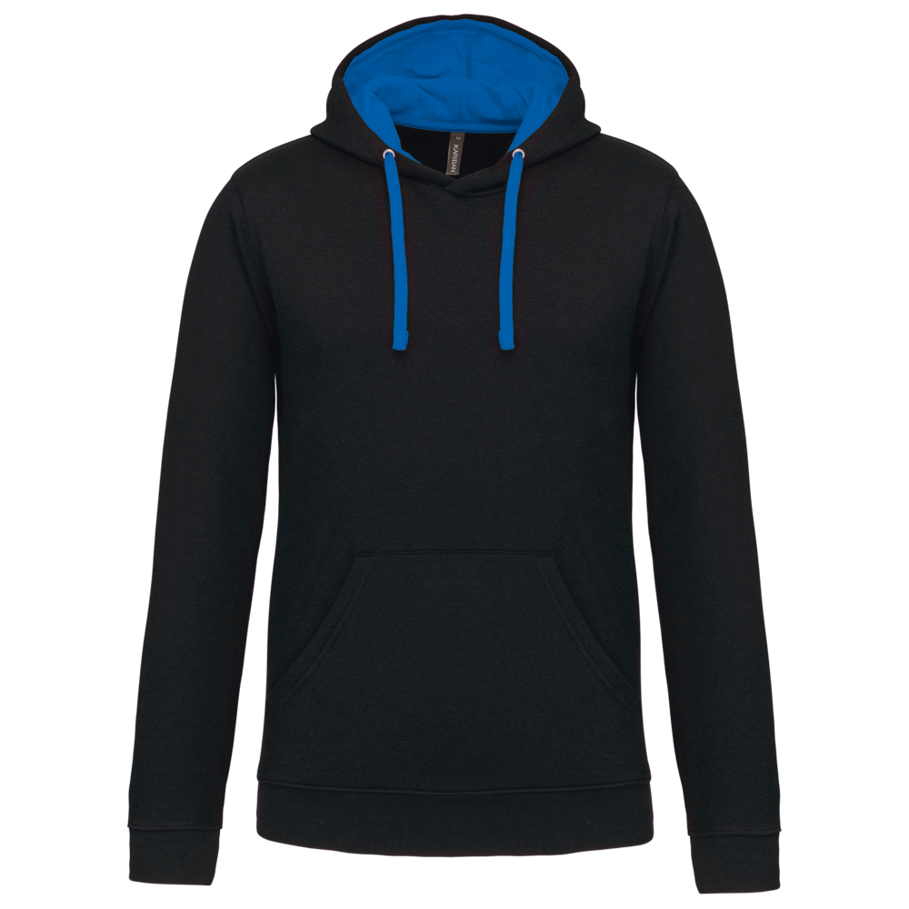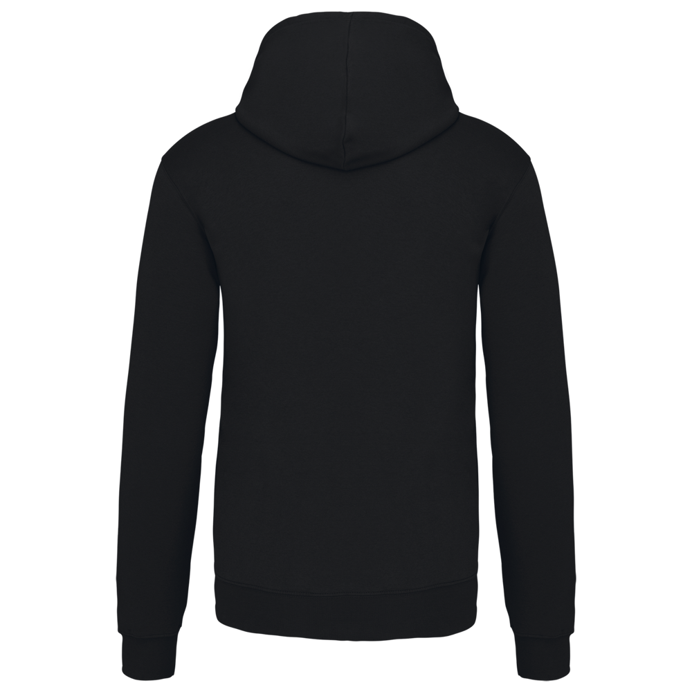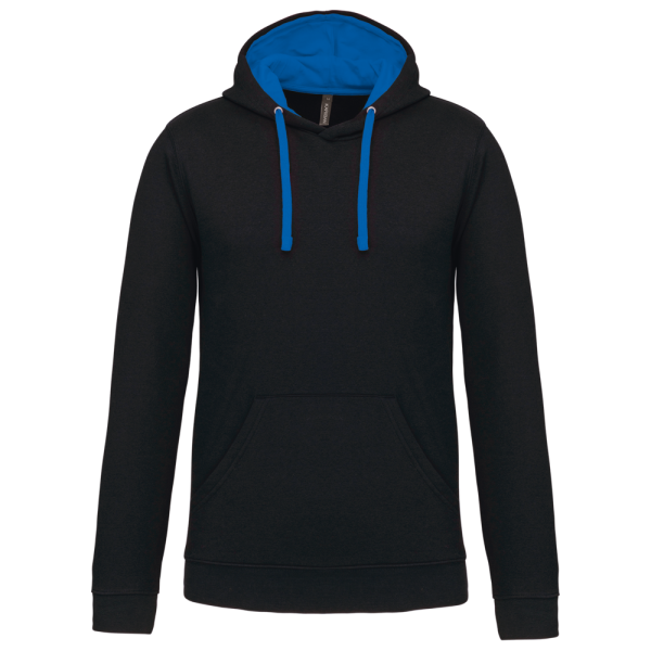 80% katoen / 20% polyester. Gekamd katoen. Geborsteld fleece aan de binnenkant. 'Kangaroe' zak aan de voorkant met gaatje voor draadje en lusje aan de kraag voor mp3-oortjes. Afwerking in ribboord. Gevoerde en gecontrasteerde capuchon met aanrijgkoordjes.