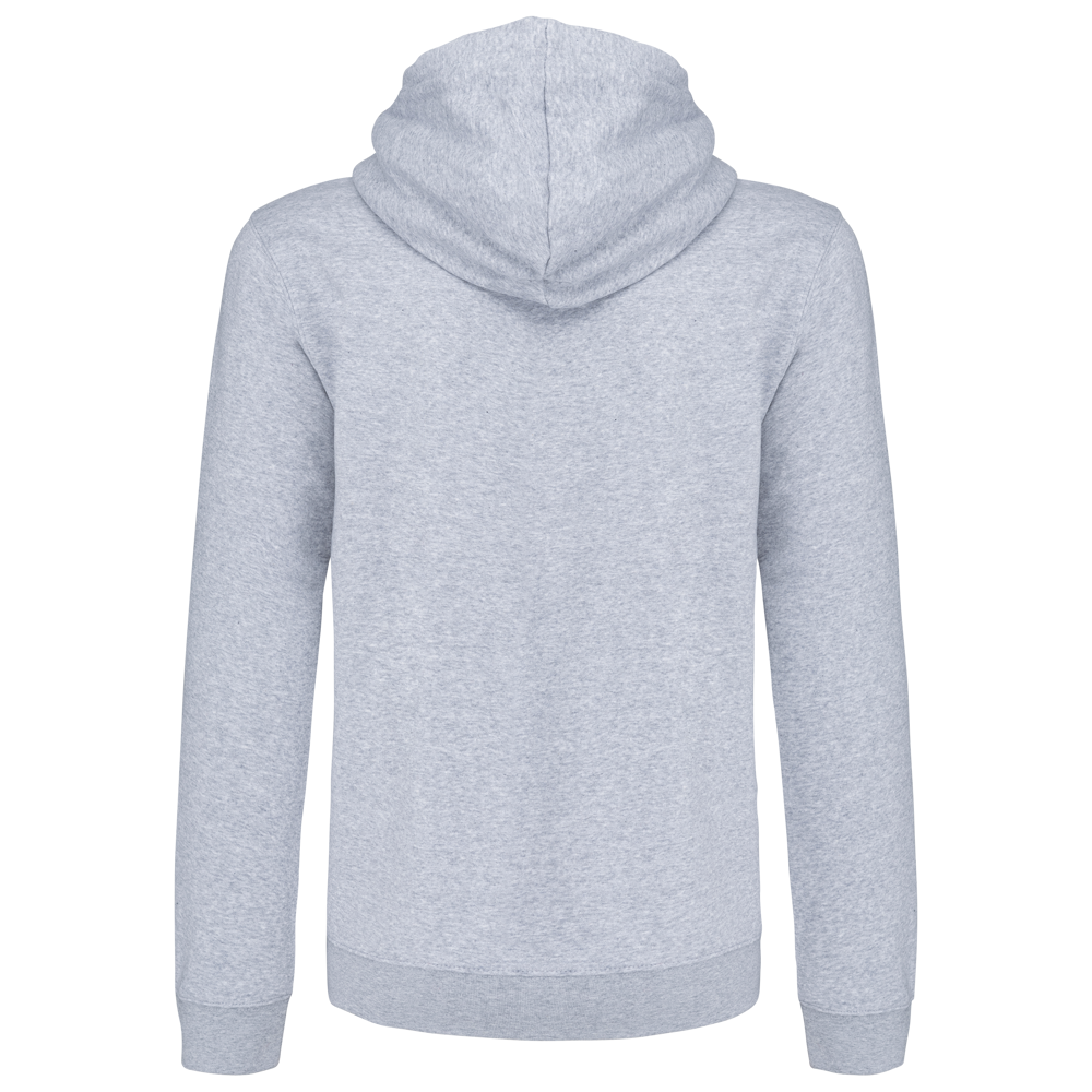 80% katoen / 20% polyester. Gekamd katoen. Geborsteld fleece aan de binnenkant. Gaatje voor draadje in de kangoeroezak en lusje aan de kraag voor oortjes. Ribboord aan mouwuiteinden en onderkant kledingstuk. Gevoerde capuchon in contrasterende kleur met aanrijgkoordjes. Rits in contrasterende kleur.
