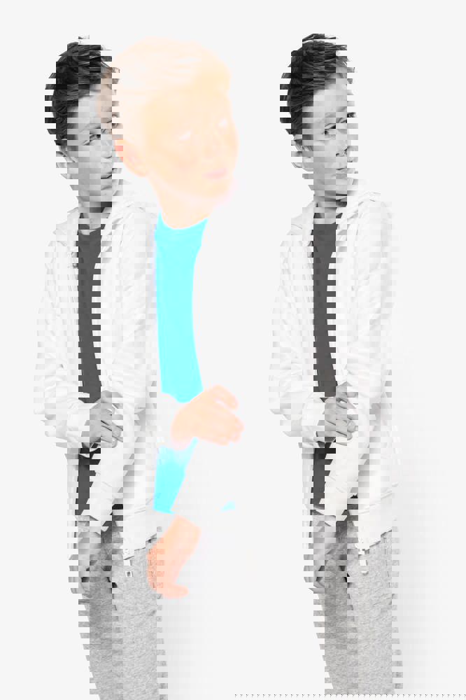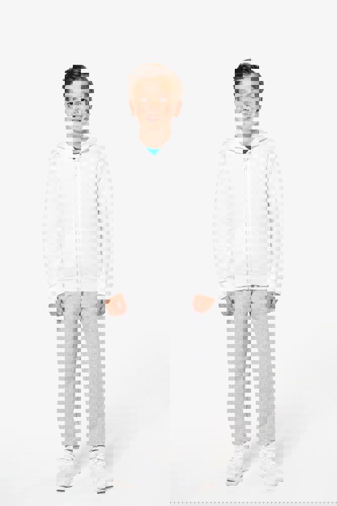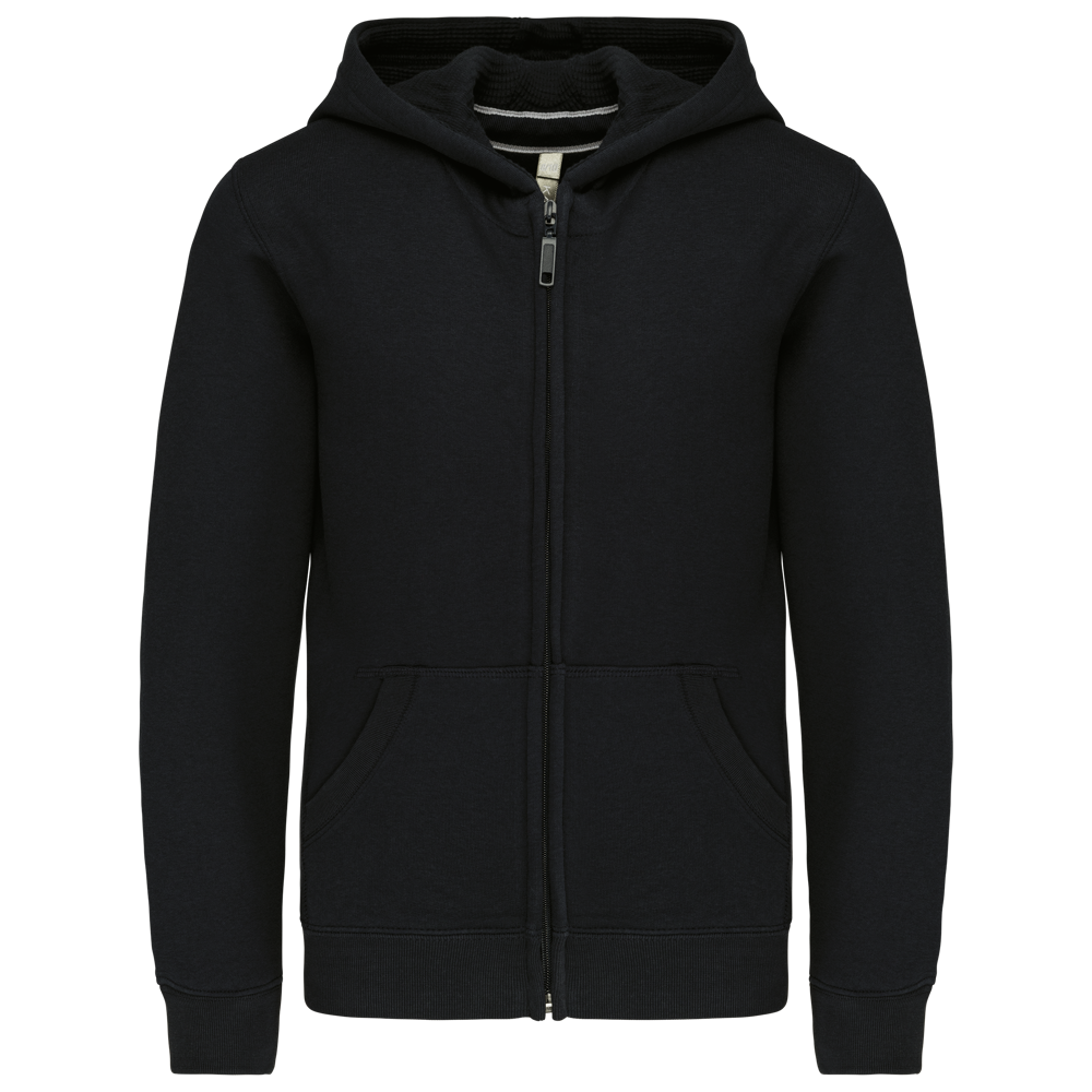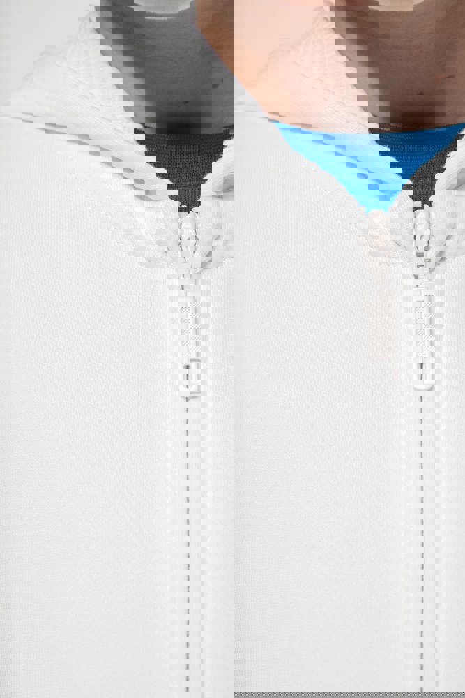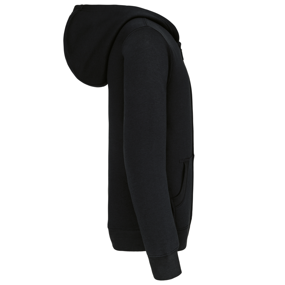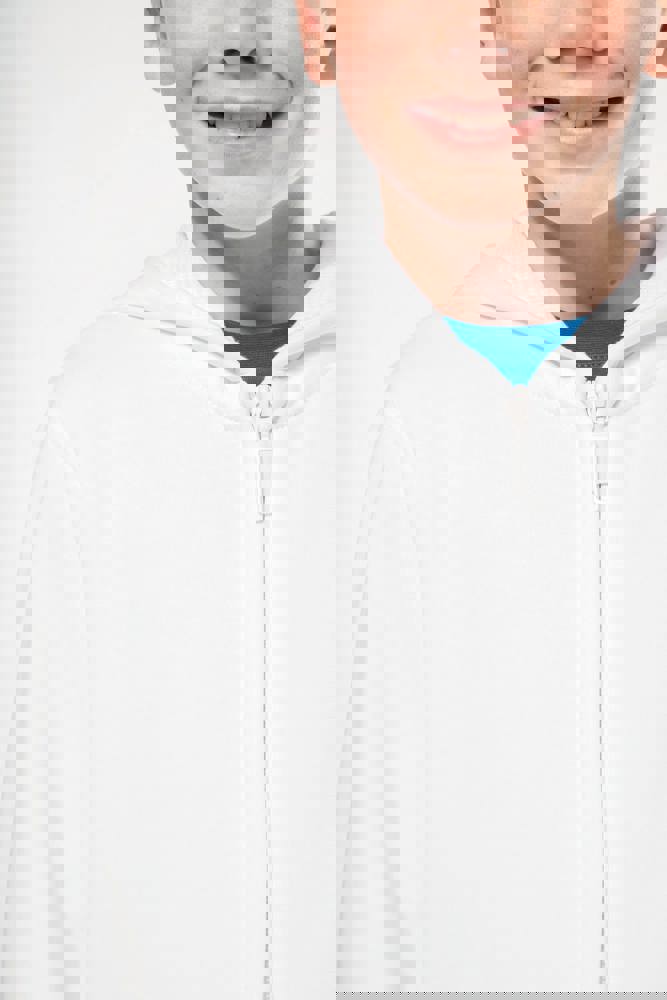 80% katoen / 20% polyester. Gekamd katoen. Geborsteld fleece aan de binnenkant. Nektape in contrastkleur. (Navy voor de kleur Oxford Grey en Oxford Grey voor alle andere kleuren). Gevoerde capuchon in honinggraatstructuur. 'Kangaroe' zakken. Afwerking in rib aan de zakken, mouwuiteinden en onderaan. Ritssluiting.