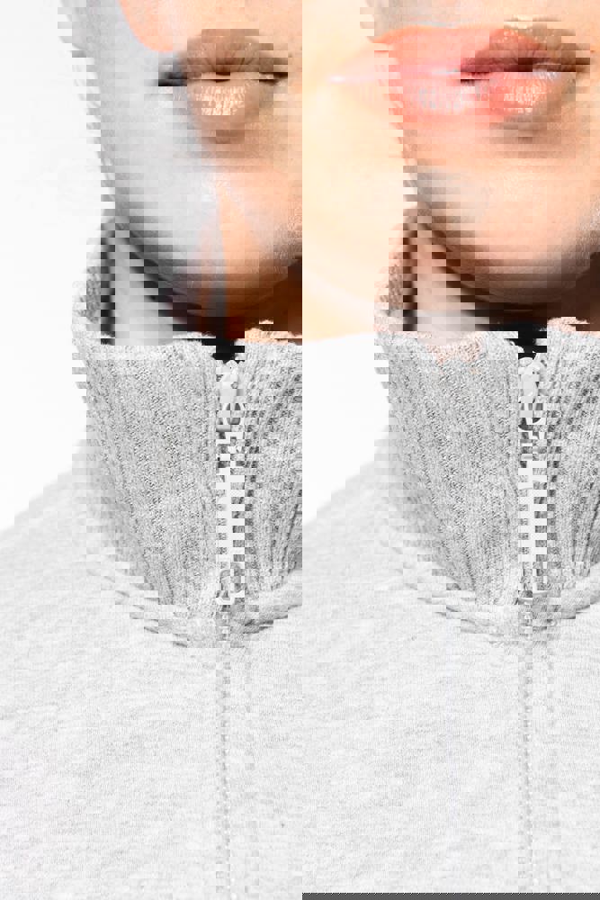 80% katoen / 20% polyester. Gekamd katoen. Low Shrunkage Fleece. Geborsteld en voorgekrompen fleece aan de binnenkant. Gewassen met siliconen. Rechte snit dankzij verticale inzetstukken in rib. Toon op toon nektape. (Behalve voor de kleur White = Oxford Grey nektape) Binnenkant kraag in rib met lijnen in contrastkleur. 2 voorzakken. Ribboord aan de mouwuiteinden en onderaan. Ritssluiting.