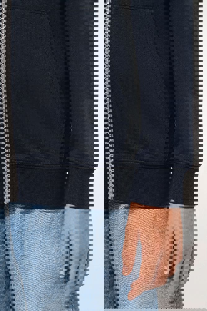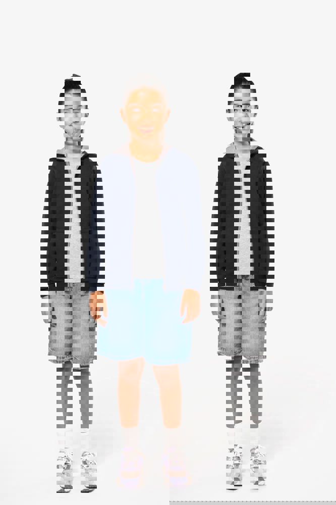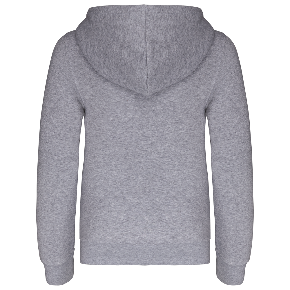 80% gekamd katoen / 20% polyester (Oxford Grey: 76% gekamd katoen / 21% polyester / 3% viscose). Geborsteld fleece aan de binnenkant. Ribboord aan mouwuiteinden en onderkant kledingstuk. Gevoerde capuchon in contrasterende kleur. Contrasterende rits. Opening voor headset-snoer in de kangoeroezak en halsopening.