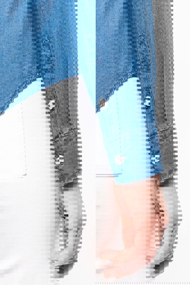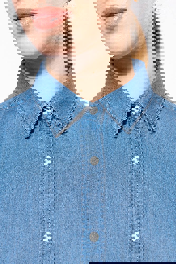 100% katoen. Licht canvas met denimlook. Zachte comfortabele stof. Trendy nauwsluitende snit. Kraag zonder knopen met aan de binnenkant een fantasiestrook. Contrasterende knopen. Regelbare manchetten. Dit product heeft een speciale behandeling ondergaan waardoor het zijn vintage look krijgt. Elk item is uniek en kleuren kunnen onderling afwijken door het was-/droogproces.