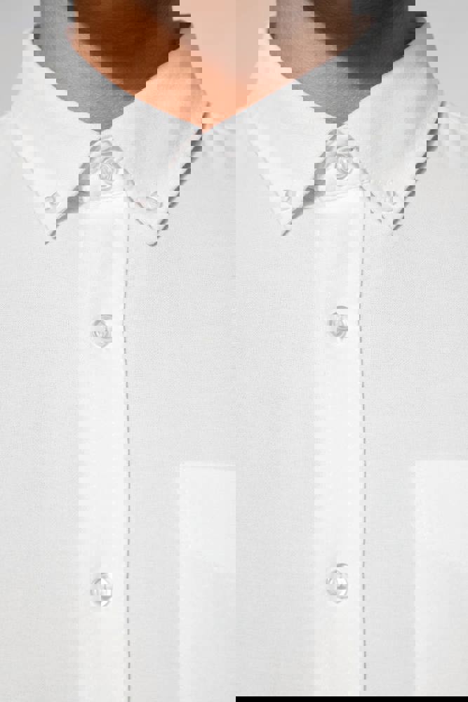 100% katoen. Rechte snit. Button down. Binnenkant van de kraag en mouwuiteinden met een contrastkleurig biesje. Toon op toon knopen. Borstzakje. Dubbel inzetstuk op de rug. Verstelbare mouwuiteinden met knopen. 2 extra knopen. Afgerond boord aan de onderkant.