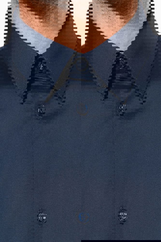 97% katoen / 3% elasthan. Getailleerd overhemd en comfortabele pasvorm. Verstevigde kraag. Toon op toon knopen. Dubbel inzetstuk op de rug. Plooitjes aan de achterkant. Afgewerkt met dubbele vouwnaden. Mouwuiteinden omgezoomd. 1 extra knoop. Afgerond boord aan de onderkant.