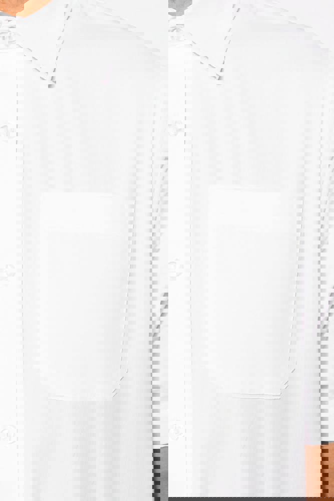 100% popeline katoen. Gemakkelijk in onderhoud ( Easy Care). Verstevigde kraag met baleinen. Toon op toon knopen. Borstzakje. Dubbel inzetstuk op de rug en 2 plooitjes. Afgewerkt met dubbele vouwnaden. Mouwuiteinden omgezoomd. 1 extra knoop. Afgerond boord aan de onderkant.