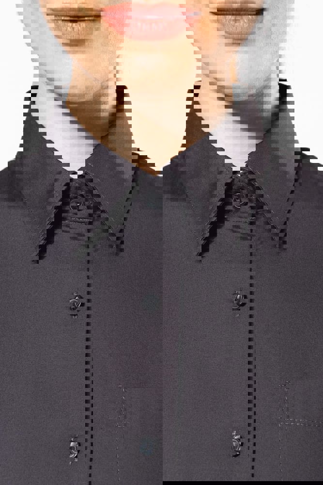 100% popeline katoen. Gemakkelijk in onderhoud ( Easy Care). Kraag zonder knopen. Toon op toon knopen. Borstzakje. Mouwuiteinden omgezoomd. 1 extra knoop. Afgerond boord aan de onderkant.