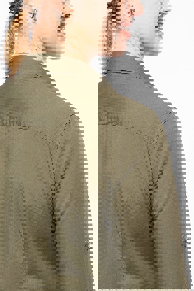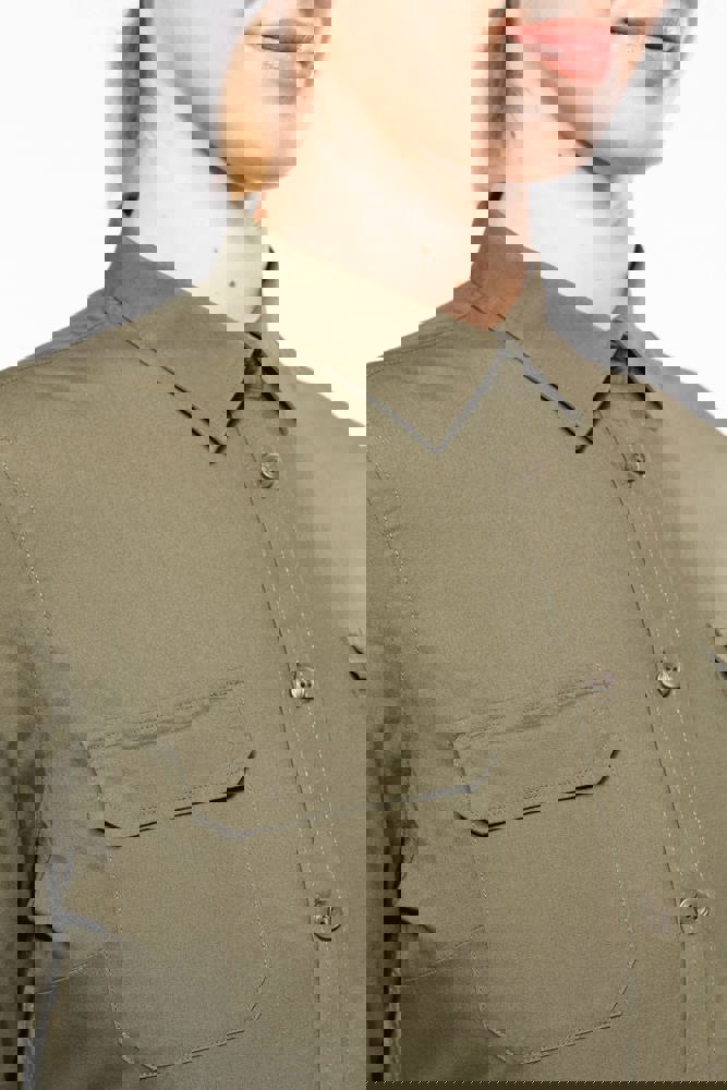 100% katoen. Popeline. Kraag zonder knopen. 2 opgezette zakken met klep aan de voorkant. Verstelbare mouwuiteinden met knoop. Opstroopbare mouwen met een knooplijst. Shirt gewassen. Dit product kreeg een speciale behandeling om het er verouderd te laten uitzien. Dit ambachtelijke procedé maakt dat er kleurverschillen zijn tussen de producten, waardoor elk stuk uniek is.