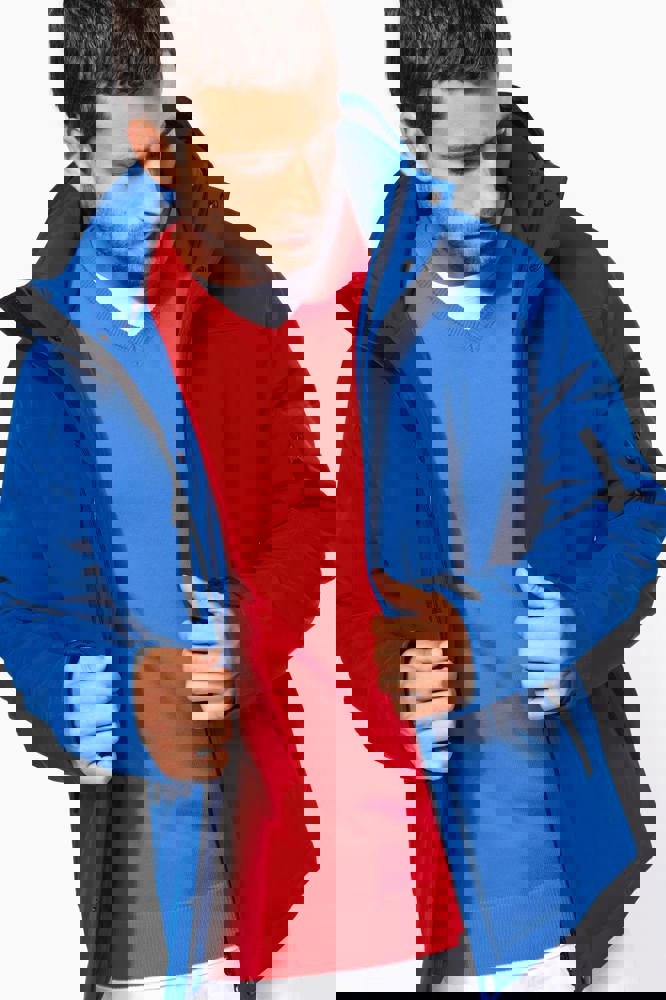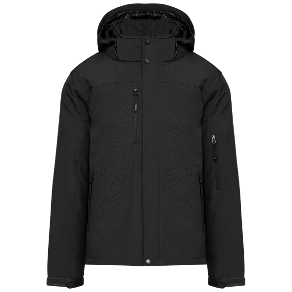 95% polyester / 5% elasthan. 3-laagse ademende stof 3000 g/m²/24 u en waterdicht 8000 mm. Buitenkant: 95% polyester / 5% elasthan. Tussenlaag: ademend membraan. Binnenlaag: microfleece. Gewatteerde voering van 100% polyester. Voorkant: 4 ritszakken (2 aan de zijkant, 1 op de mouw, 1 rechts op de borst). 2 binnenzakken met drukknoop. Afneembare capuchon met 3 gevoerde en gewatteerde panelen, regelbaar met stoppers. Met klittenband regelbare mouwuiteinden. 1 rits aan de linkerkant en 1 drukkersrits.