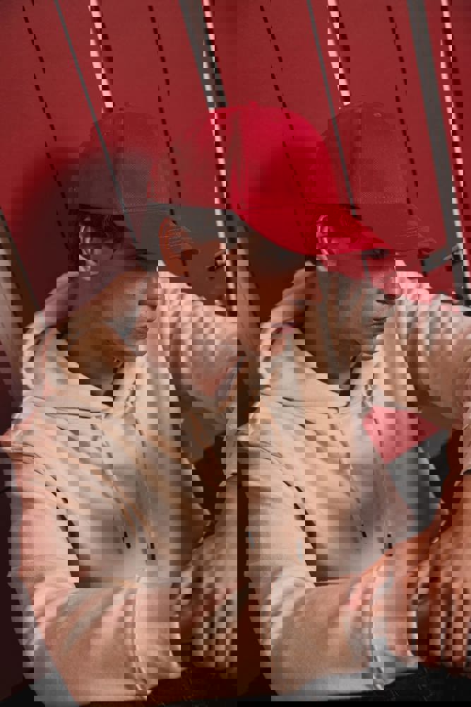 100% katoen. Gekamd katoen. Pet 6 panelen Sluiting aan de achterkant met metalen gesp.