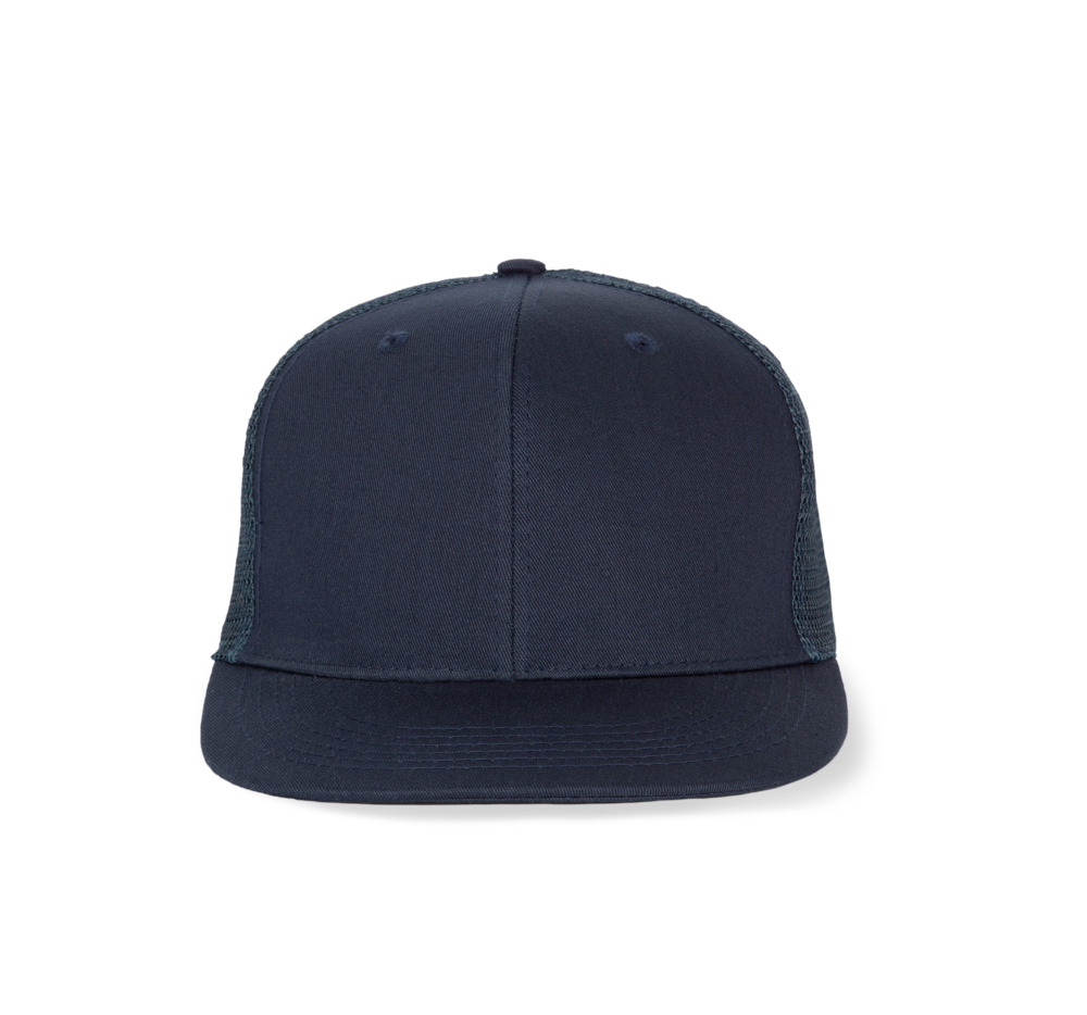 100% katoenen cap met 100% polyester mesh. 6 verstevigde panelen met platte klep. Katoenen zweetband. Verstelbare plastic sluiting.