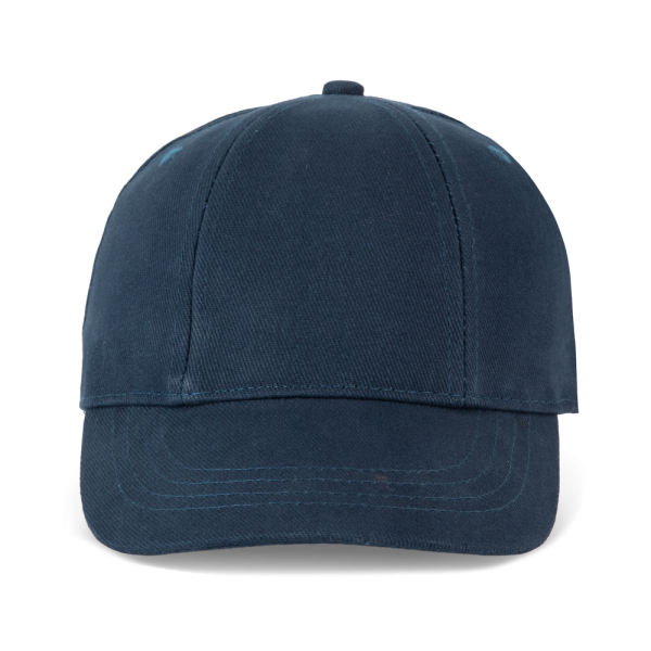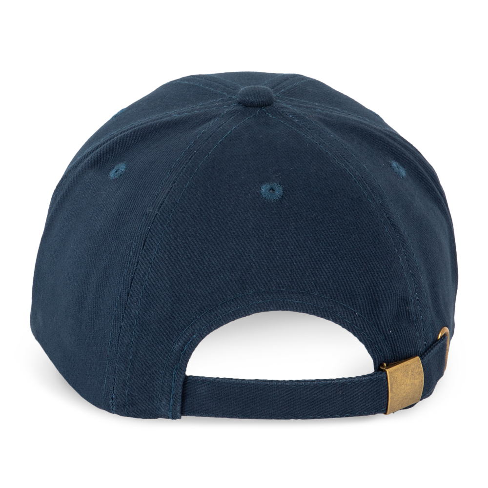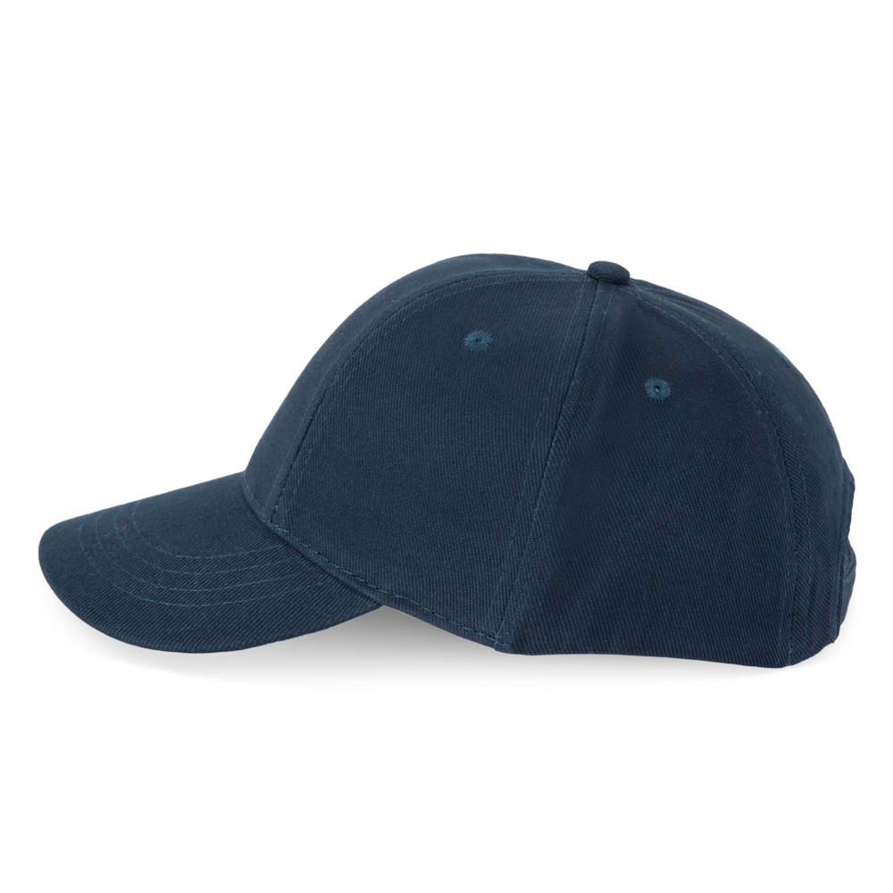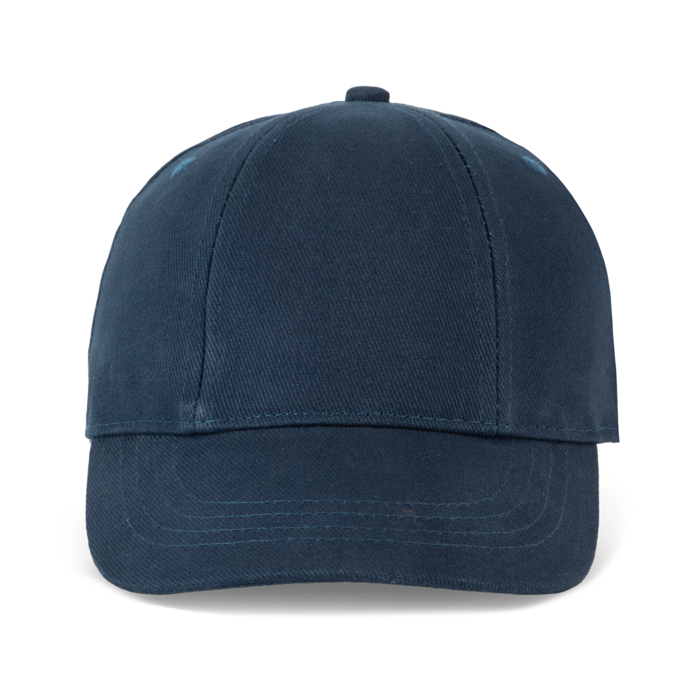 100% geborstelde zware katoen. 6 verstevigde panelen. Voorpaneel eenvoudig te bedrukken. Verstelbare metalen gesp-sluiting.