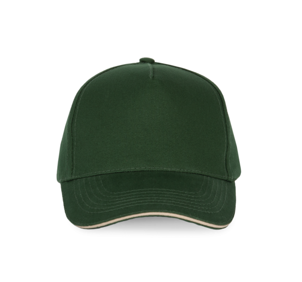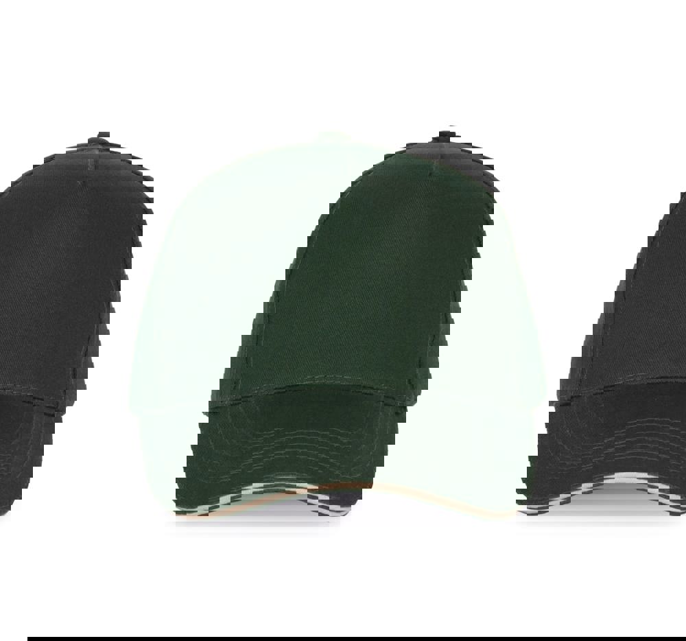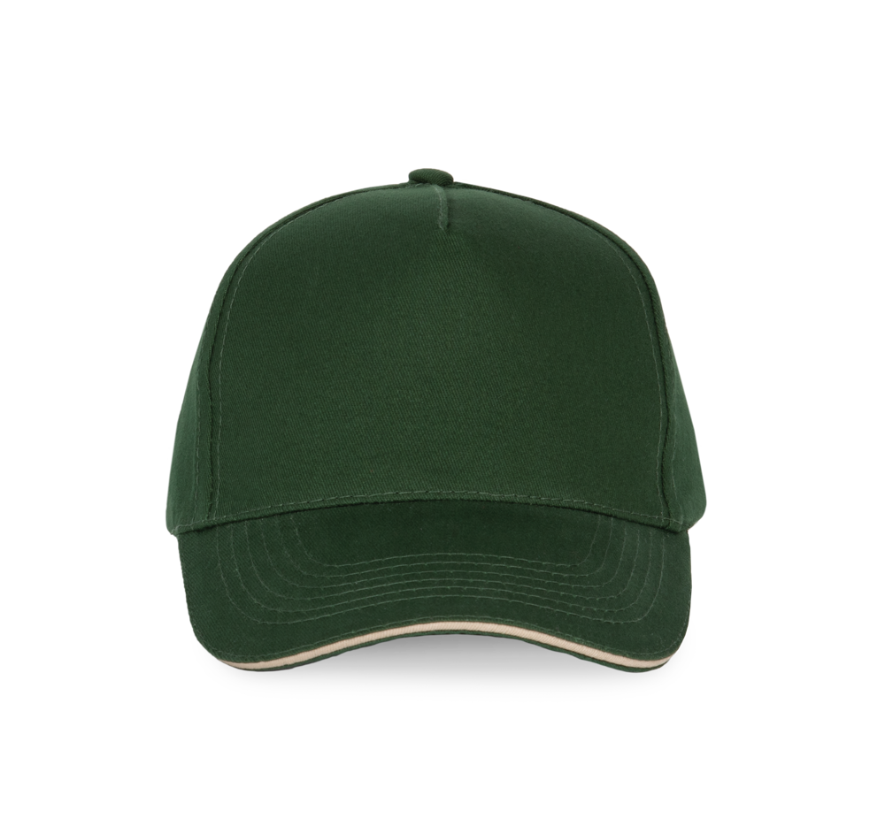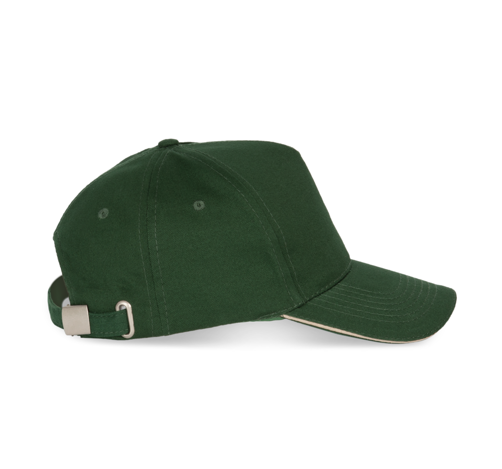 100% zwaar geborsteld sergé katoen. 5 panelen. Klep met contstrasterende bies. Katoenen zweetband. Verstelbare gesp-sluiting.