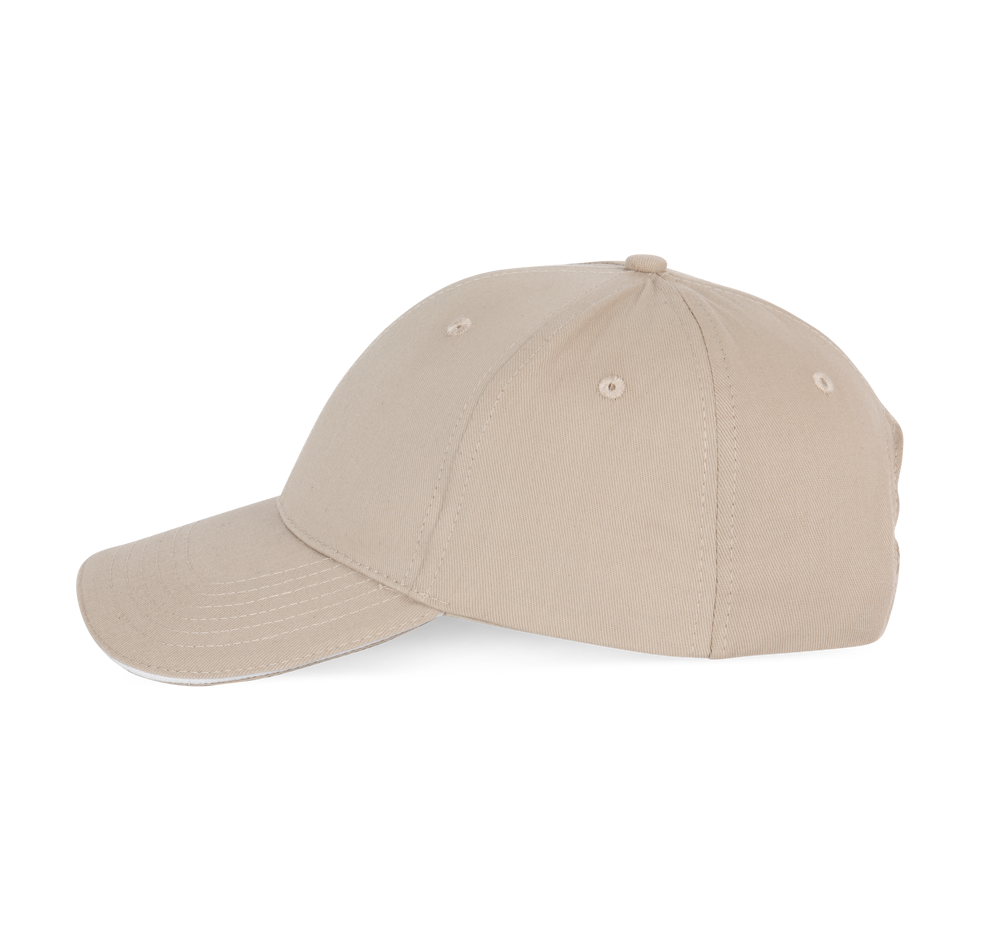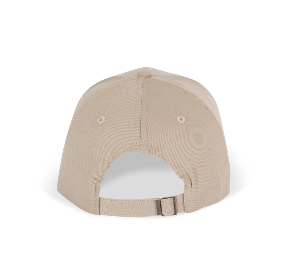 100% twillkatoen. 6 panelen. Contrasterende bies. Verstelbare sluiting aan de achterkant met metalen gesp.