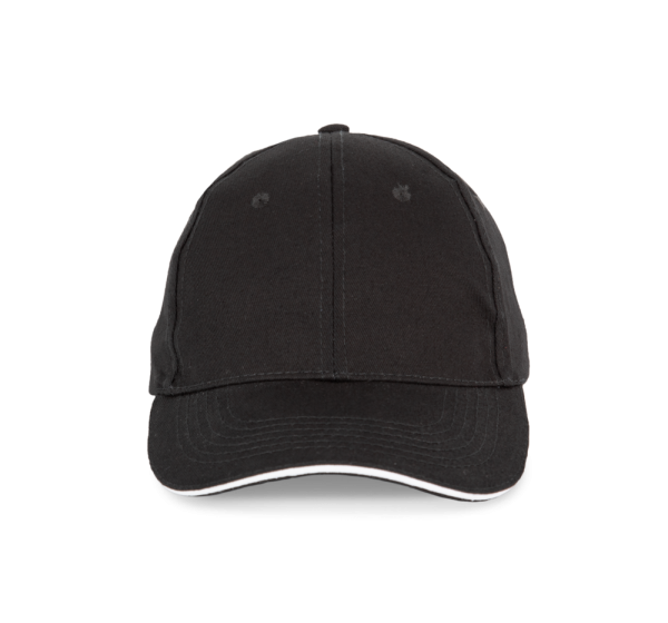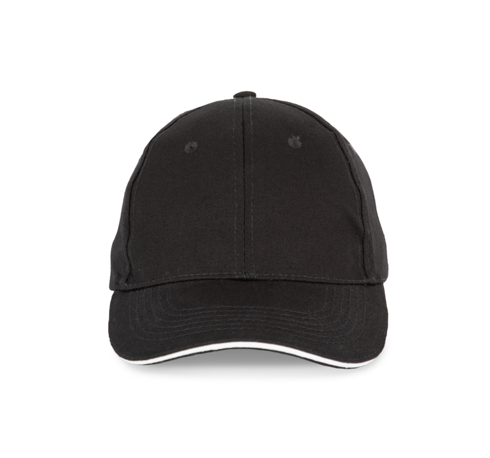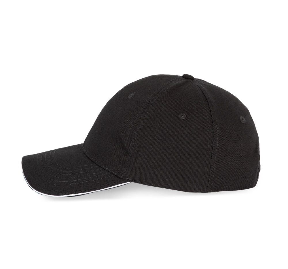 100% twillkatoen. 6 panelen. Contrasterende bies. Verstelbare sluiting aan de achterkant met metalen gesp.
