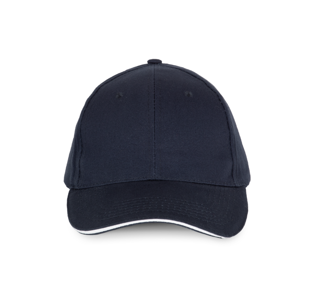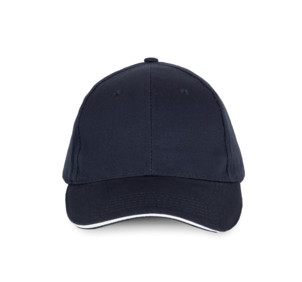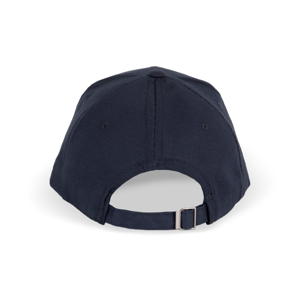 100% twillkatoen. 6 panelen. Contrasterende bies. Verstelbare sluiting aan de achterkant met metalen gesp.