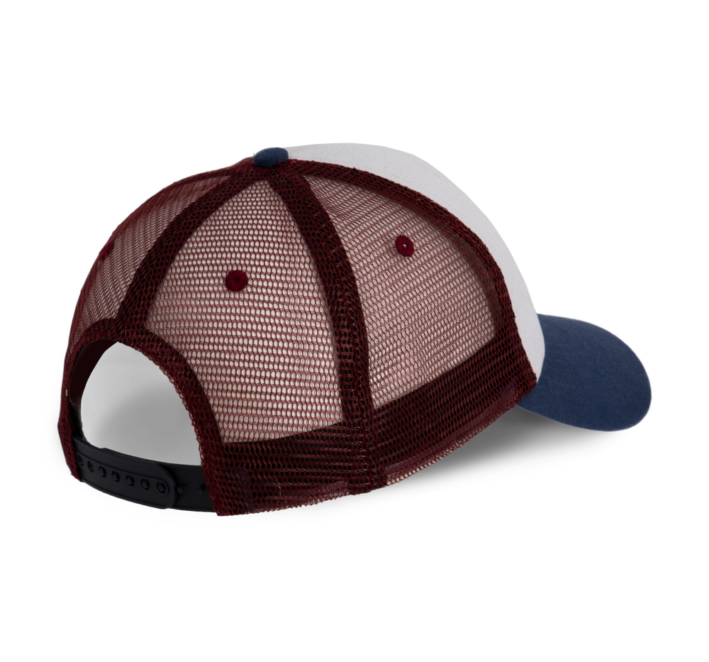 98% katoen / 2% polyester. Truckerpet met 5 panelen. Voorste panelen en zonneklep van canvaskatoen en mesh van polyester. Verstelbare druksluiting van plastic.