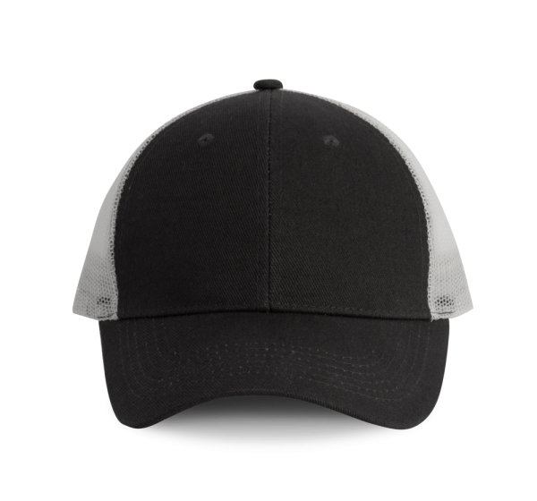 100% katoen / 100% polyester. Pet Trucker met 6 panelen.De voorste panelen en de afgeronde zonneklep zijn gemaakt van katoen, de mesh van polyester. Met een verstelbare druksluiting van plastic.