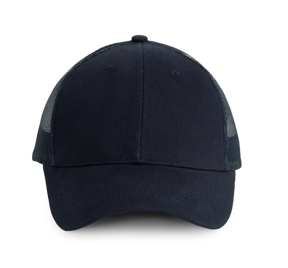100% katoen / 100% polyester. Pet Trucker met 6 panelen.De voorste panelen en de afgeronde zonneklep zijn gemaakt van katoen, de mesh van polyester. Met een verstelbare druksluiting van plastic.