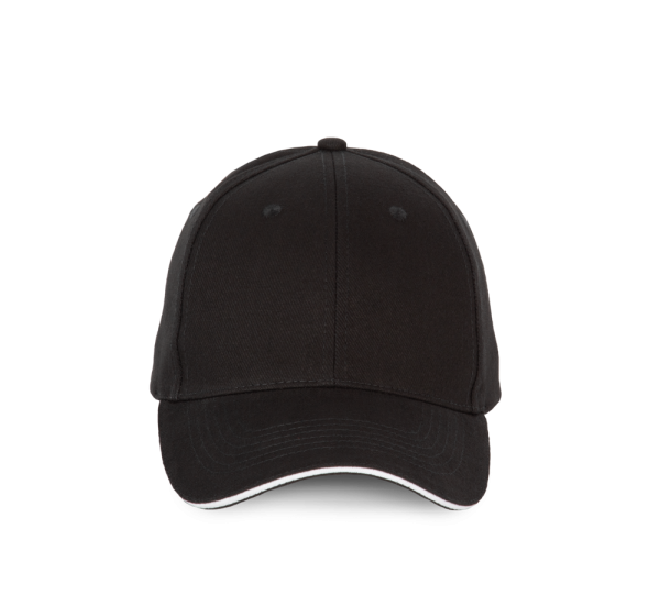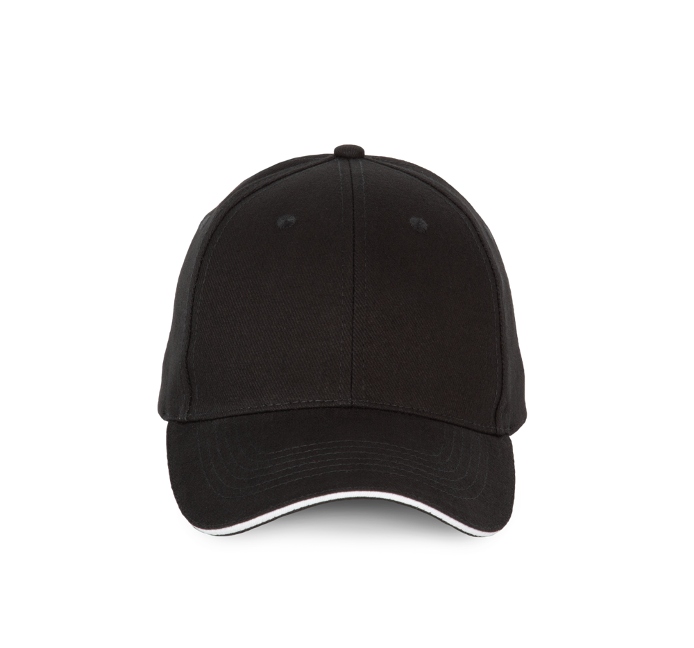 100% katoen. Pet met 6 panelen en contrasterende bies. Verstelbare sluiting met metalen gesp en zelfblokkerende lus.