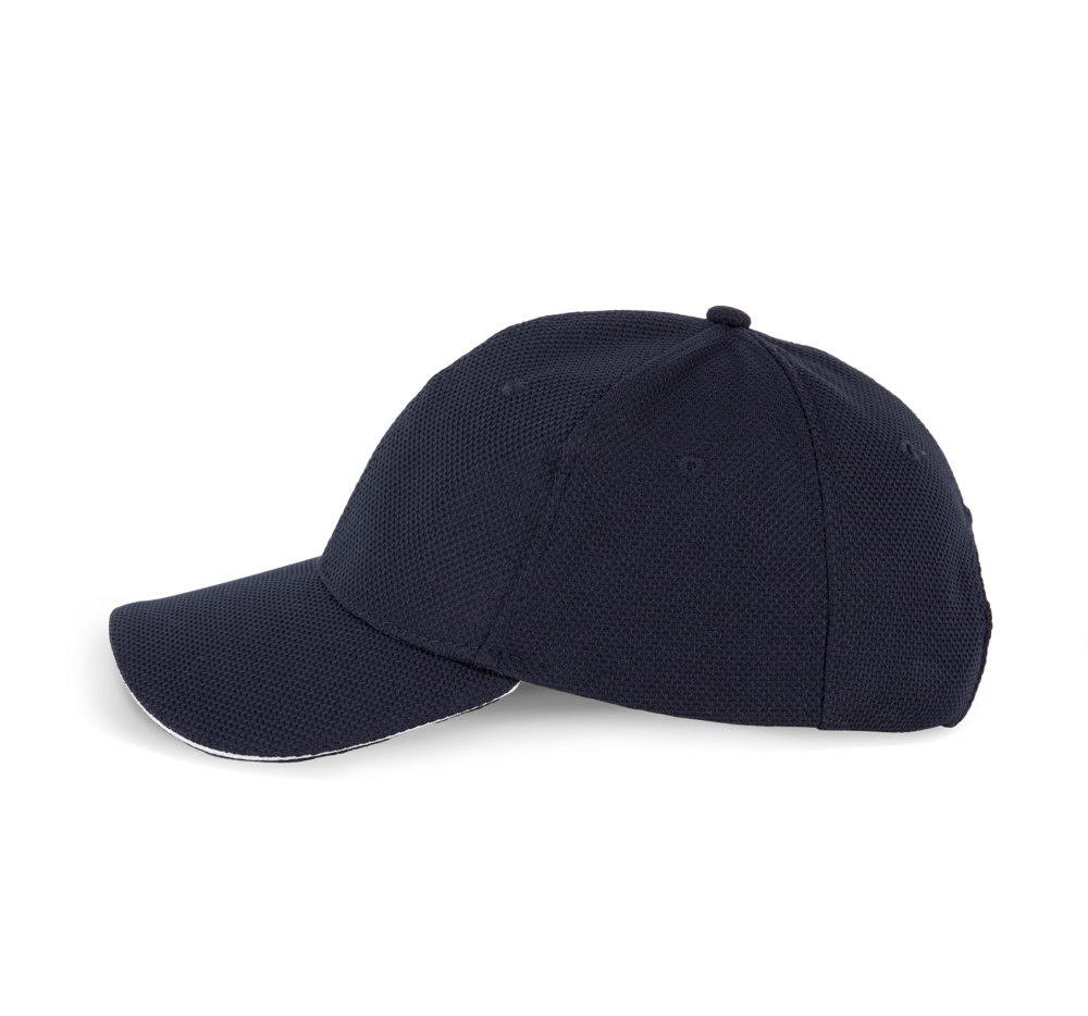 100% polyester piqué. Luchtgaatjes. Rand van de klep in contrastkleur. Afgezet met een band van badstof aan de binnenkant voor een optimaal comfort. Verstelbare sluiting van klittenband.