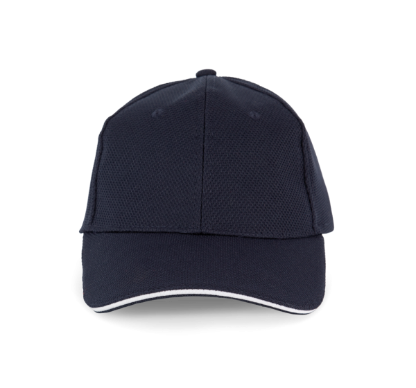 100% polyester piqué. Luchtgaatjes. Rand van de klep in contrastkleur. Afgezet met een band van...meer
