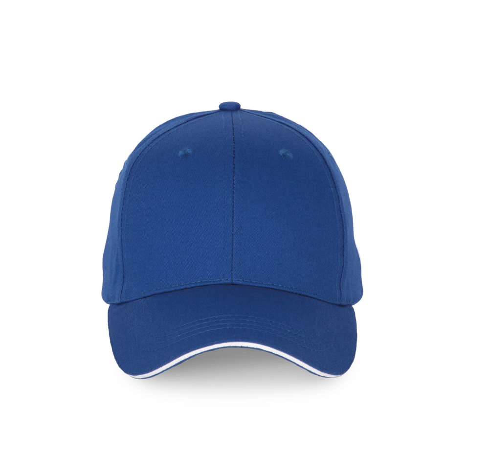100% katoen. Pet met 6 panelen en contrasterende bies. Verstelbare sluiting met metalen gesp en zelfblokkerende lus.