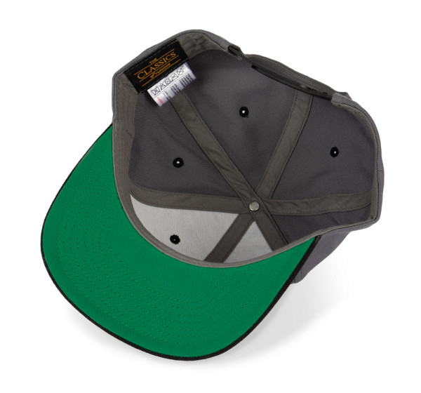 80% acryl / 20% wol. 6 panelen. Klassiek model van de beste kwaliteit. Platte zonneklep, hoog profiel, verstevigde voorpanelen. Onderkant van de zonneklep in contrasterend groen. Verstelbare druksluiting van plastic.