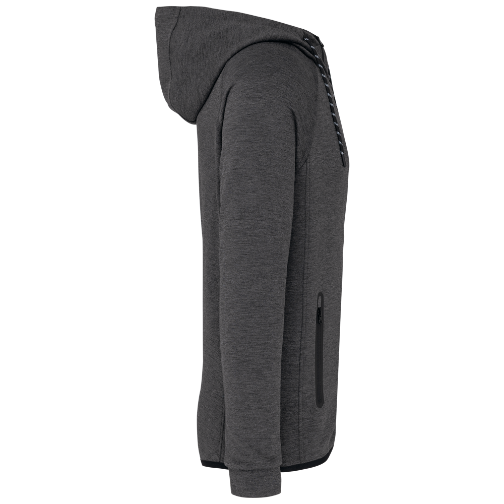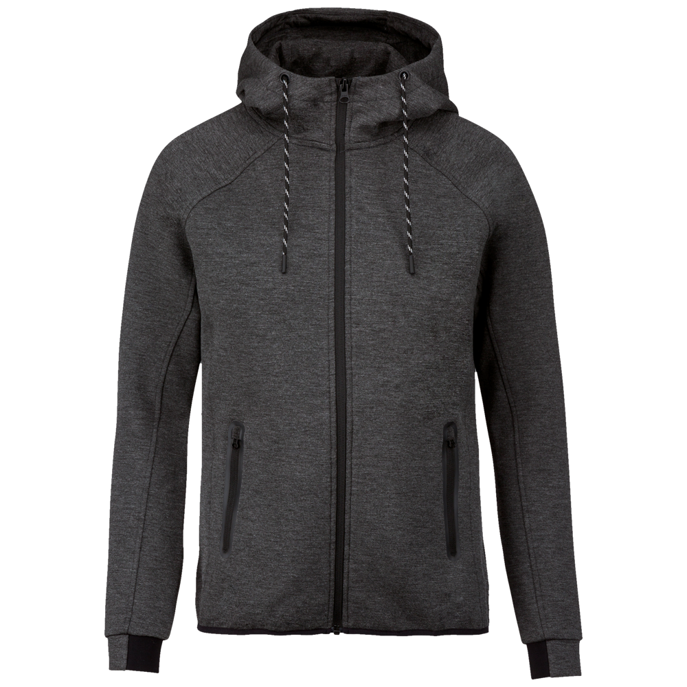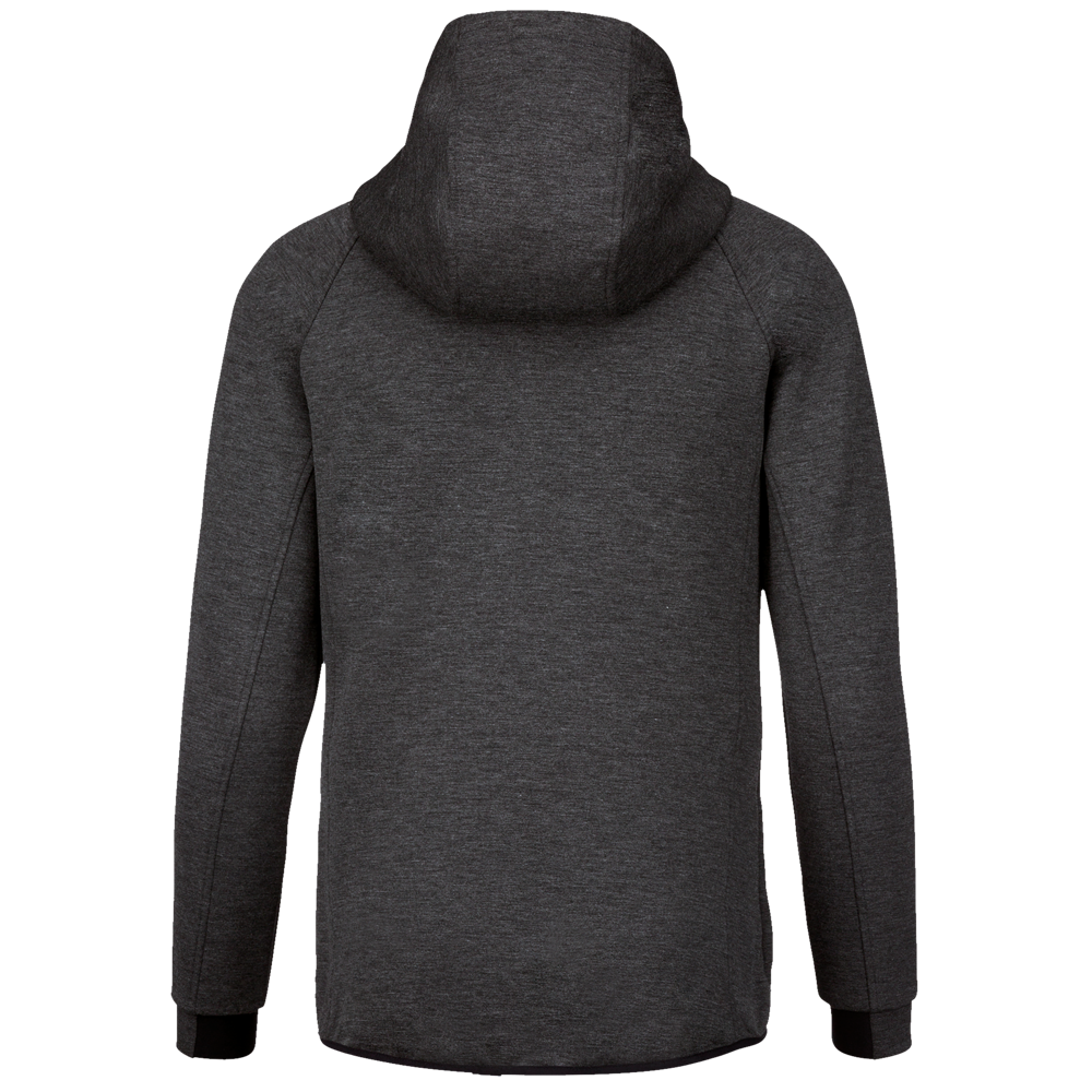 94% polyester / 6% elasthan. (Heather : 79% polyester / 15% viscose / 6% elasthan). Hele comfortabele stof. Ritssluiting. 2 ritszakken met warmtegelaste afwerking aan de voorkant. Capuchon met jerseyvoering van 65% polyester / 35% viscose met tweekleurige aanrijgkoordjes, afgewerkt met een plastic uiteinde. Nauwsluitende mouwuiteinden met een contrasterend, elastisch stuk. Onderkant kledingstuk afgewerkt met een contrasterende zoom. Black op alle kleuren en Dark Grey op de Ash Heather (sluitingen ook).
