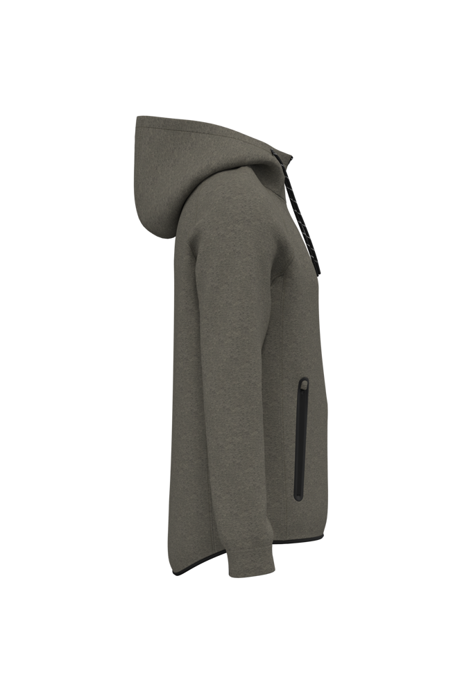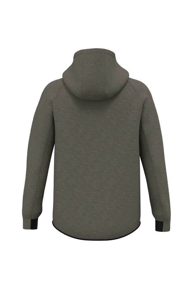 94% polyester / 6% elasthan. (Heather : 79% polyester / 15% viscose / 6% elasthan). Hele comfortabele stof. Ritssluiting. 2 ritszakken met warmtegelaste afwerking aan de voorkant. Capuchon met jerseyvoering van 65% polyester / 35% viscose met tweekleurige aanrijgkoordjes, afgewerkt met een plastic uiteinde. Nauwsluitende mouwuiteinden met een contrasterend, elastisch stuk. Onderkant kledingstuk afgewerkt met een contrasterende zoom. Black op alle kleuren en Dark Grey op de Ash Heather (sluitingen ook).