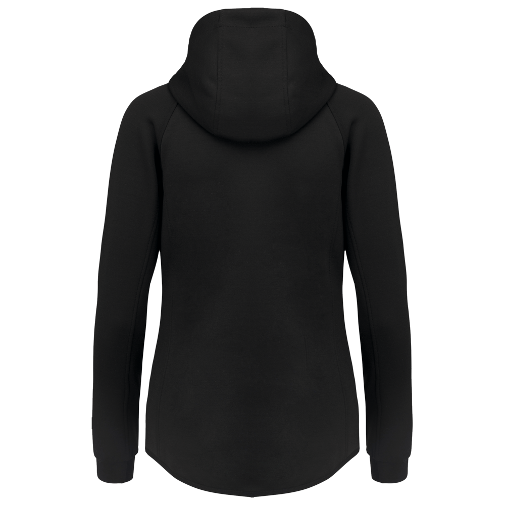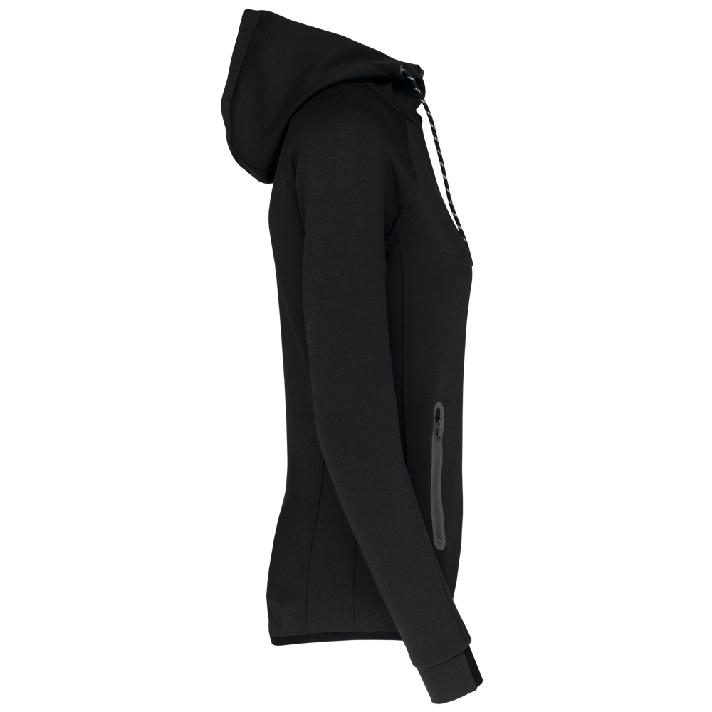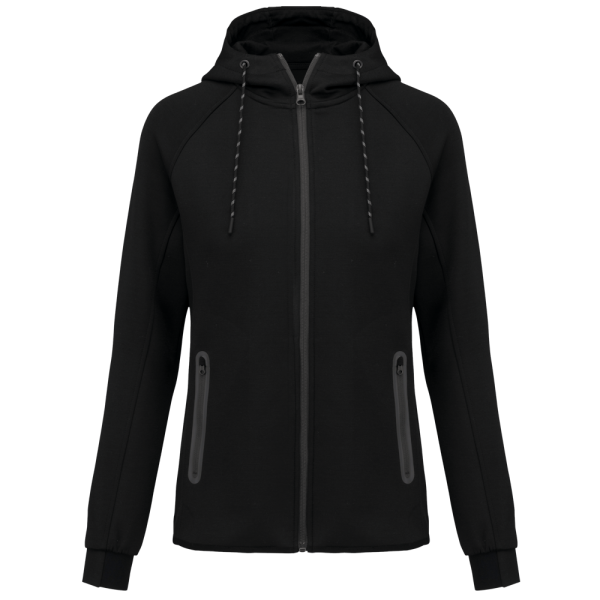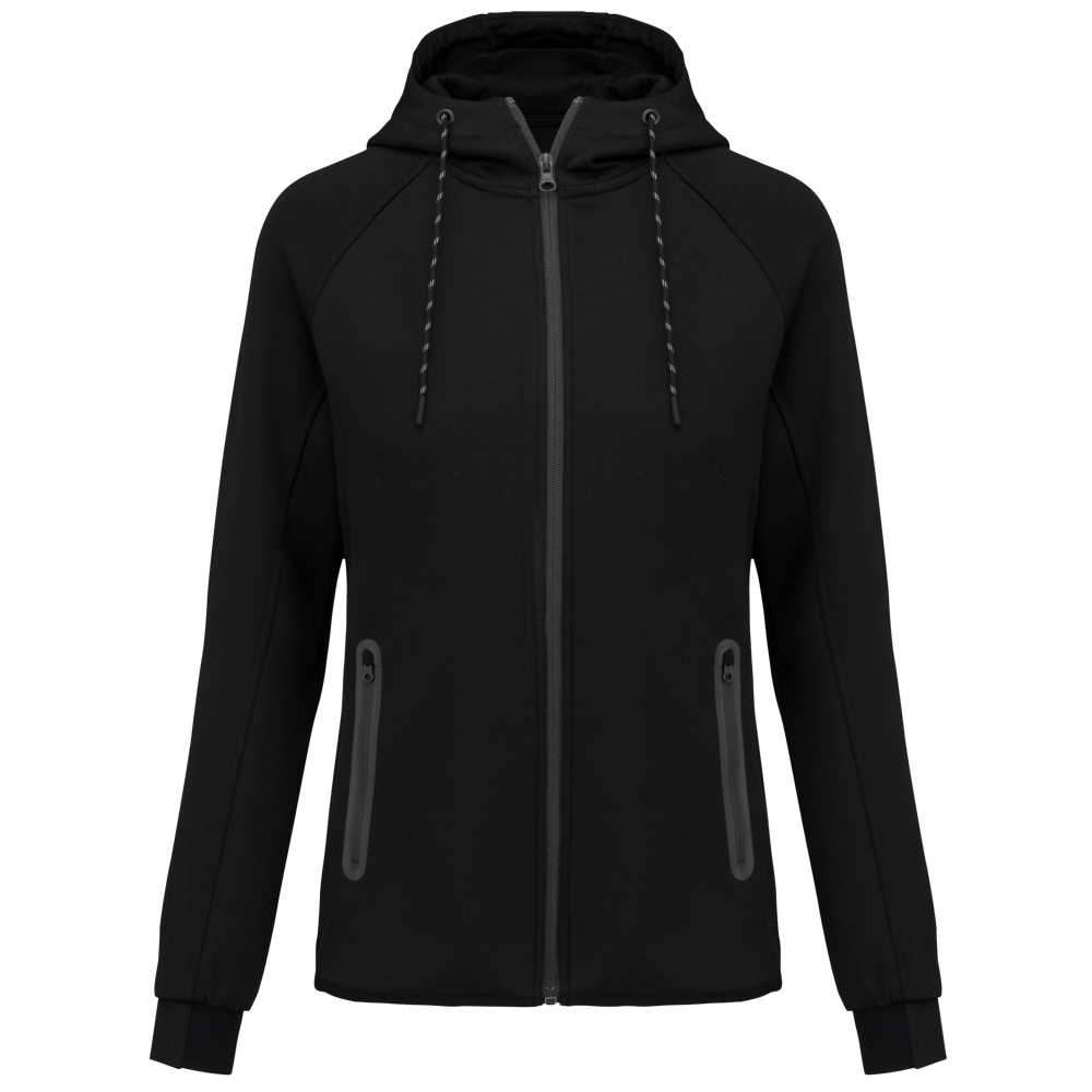 94% polyester / 6% elasthan. (Heather : 79% polyester / 15% viscose / 6% elasthan). Slim fit. Hele comfortabele stof. Ritssluiting. 2 ritszakken met warmtegelaste afwerking aan de voorkant. Capuchon met jerseyvoering van 65% polyester / 35% viscose met tweekleurige aanrijgkoordjes, afgewerkt met een plastic uiteinde. Nauwsluitende mouwuiteinden met een contrasterend, elastisch stuk. Onderkant kledingstuk afgewerkt met een contrasterende biaisband. Black op alle kleuren en Dark Grey op de Ash Heather (sluitingen ook).