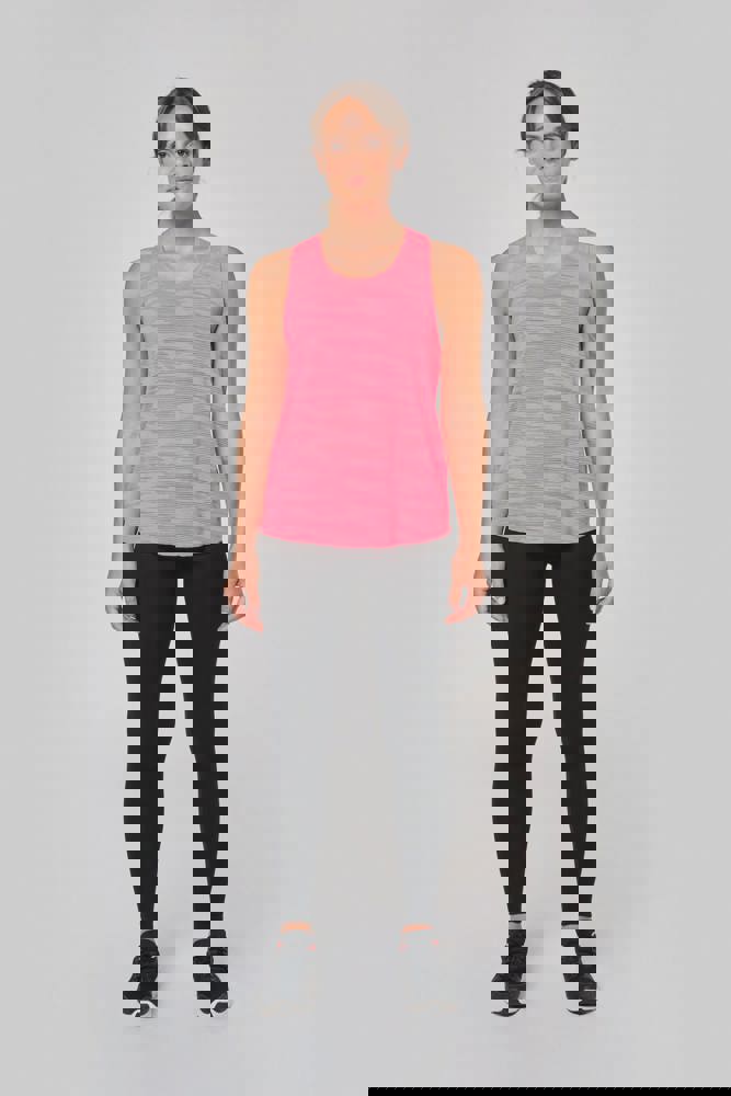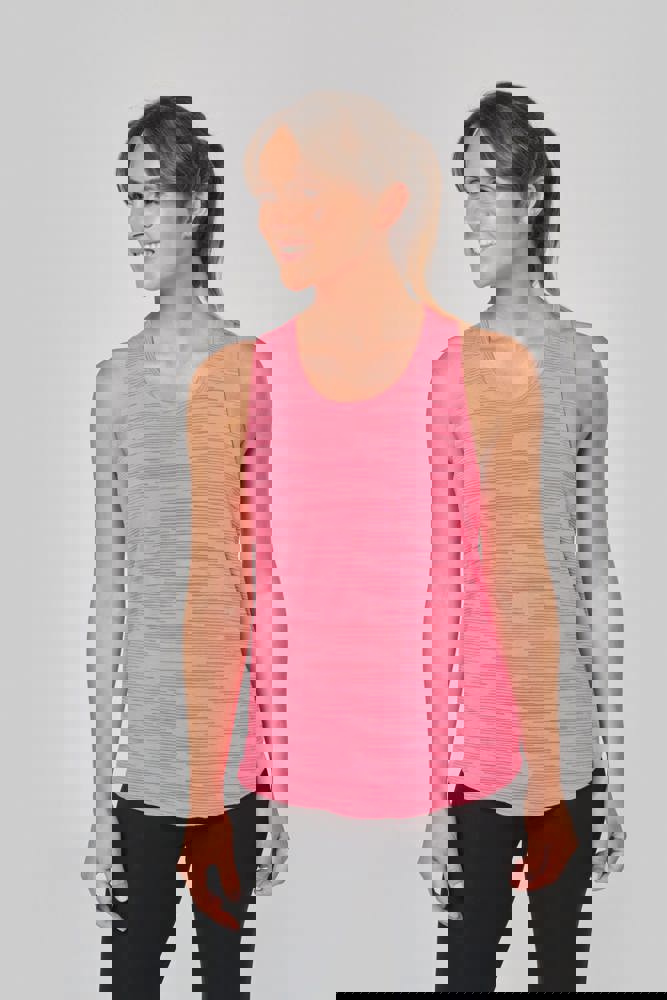 65% polyester / 35% viscose - Soepel jersey met gevlamd effect. Ruime snit. Grote armsgaten en racerback. Ronde halsopening met nektape aan de binnenkant. Licht afgerond boord.