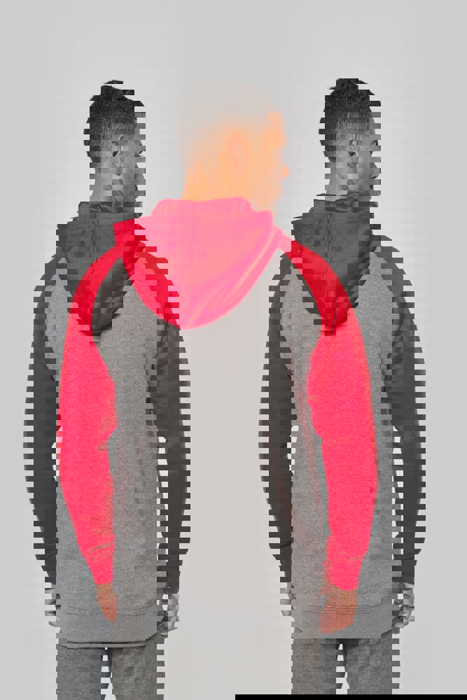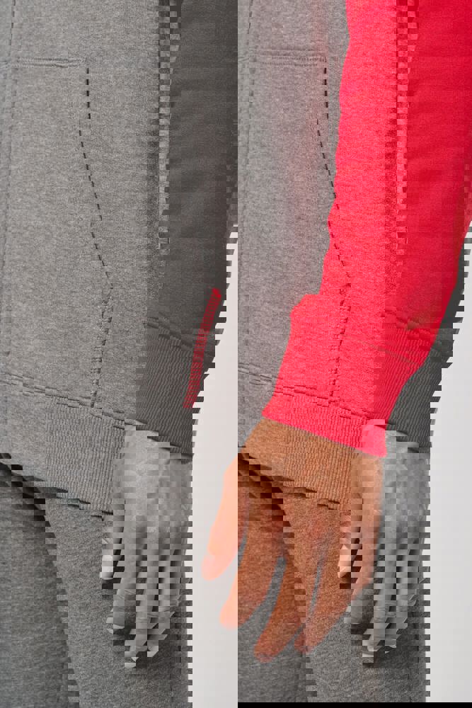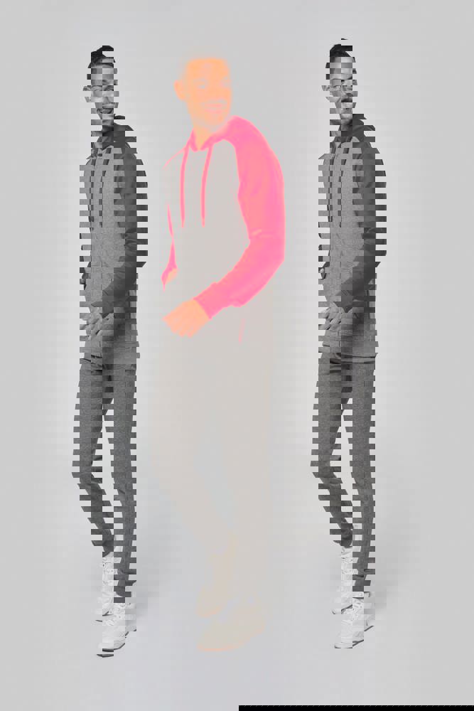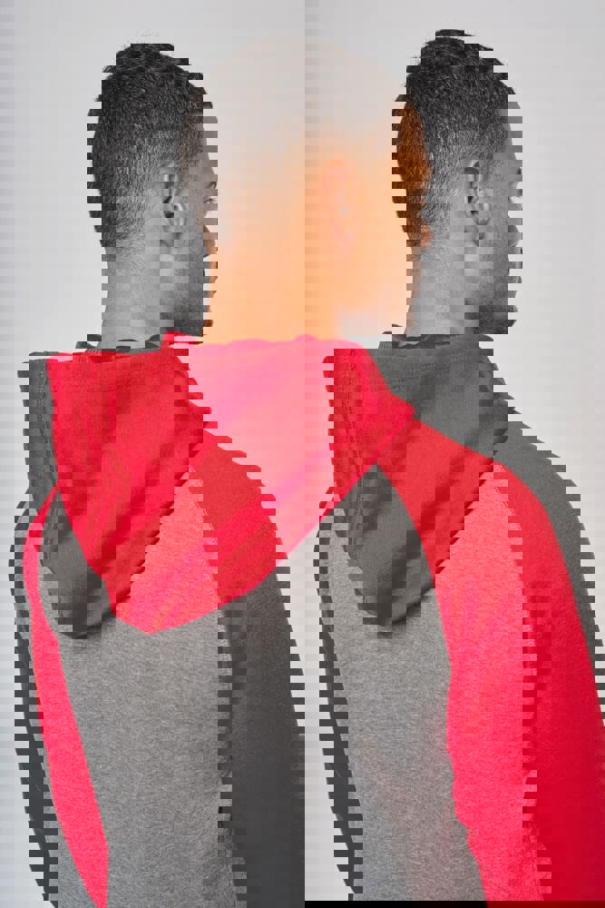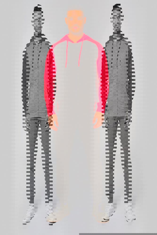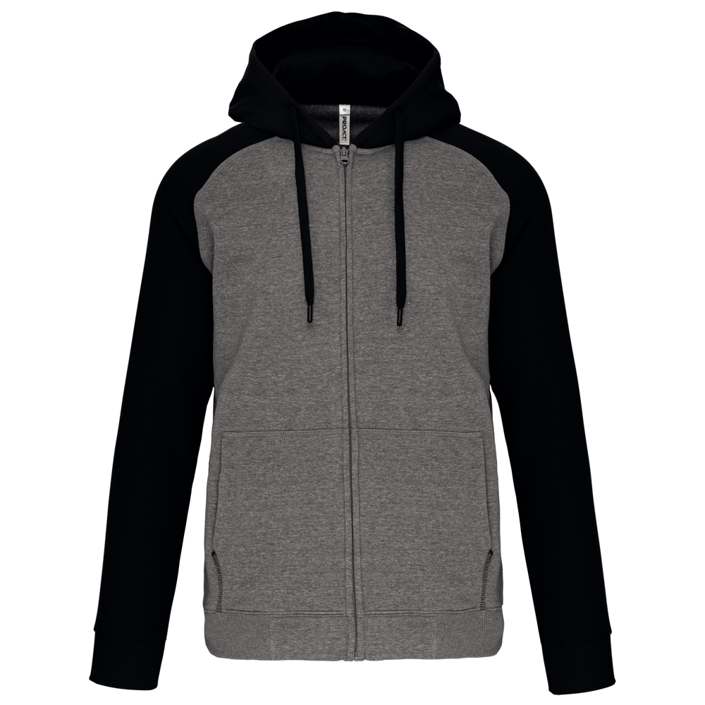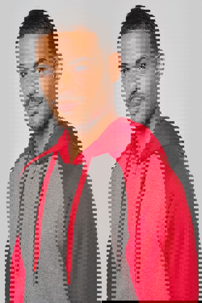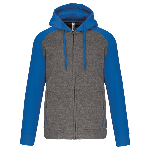 65% polyester / 35% katoen. Geborsteld fleece aan de binnenkant. Ritssluiting. Contrasterende raglanmouwen en capuchon. Capuchon gevoerd met toon op toon mesh. Kangoeroezakken met fluorescerend gsm-zakje. Opening voor headset-snoer. Mouwboorden en onderzijde in 2x2 ribboord met dubbele dikte.