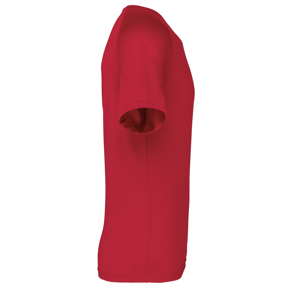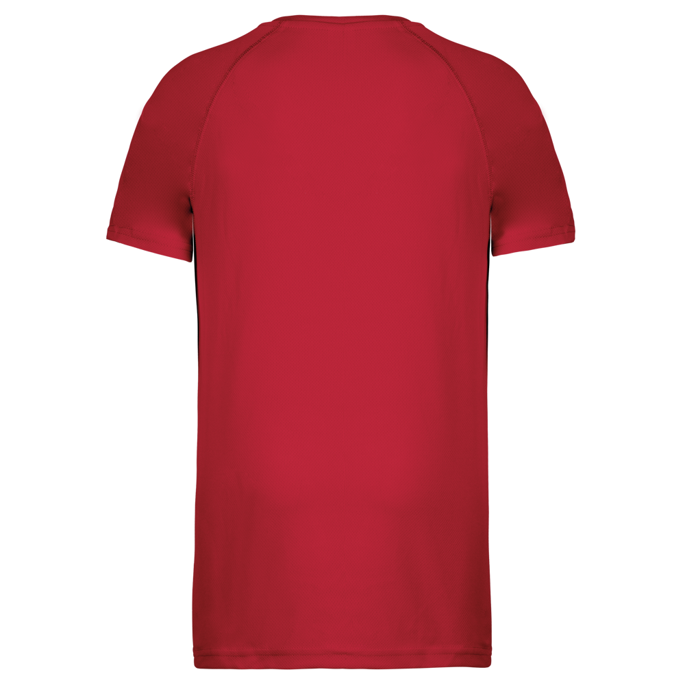 100% polyester. Sneldrogende lichte stof. Ronde hals. Nektape. Raglan mouwen met overstiksels. Afwerking met dubbele stiksels aan de mouwuiteinden en onderkant.