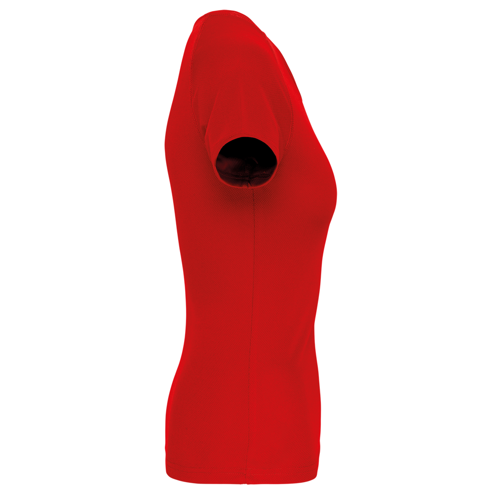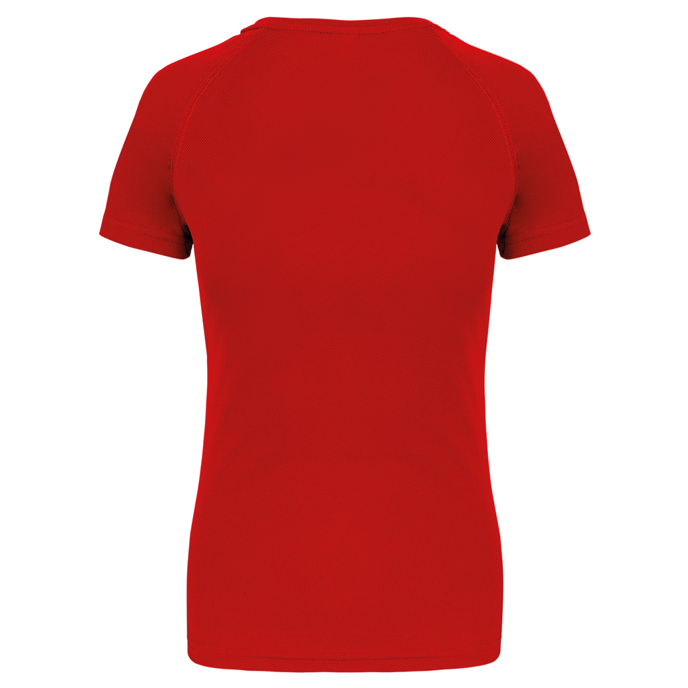 100% polyester. Sneldrogende lichte stof. Ronde hals. Nektape. Raglan mouwen met overstiksels. Afwerking met dubbele stiksels aan de mouwuiteinden en onderkant.