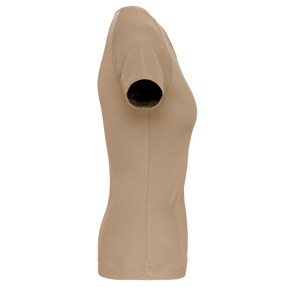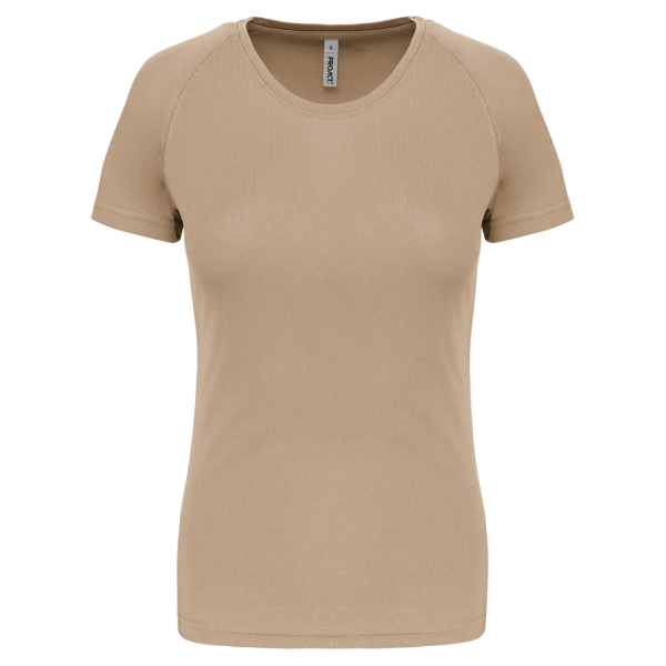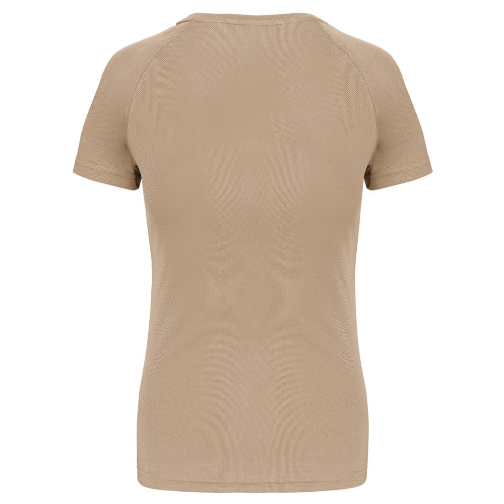 100% polyester. Sneldrogende lichte stof. Ronde hals. Nektape. Raglan mouwen met overstiksels. Afwerking met dubbele stiksels aan de mouwuiteinden en onderkant.
