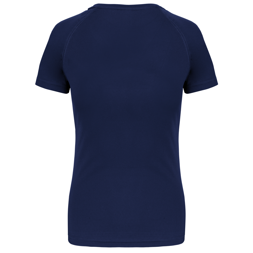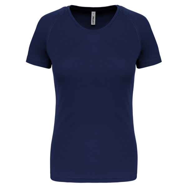 100% polyester. Sneldrogende lichte stof. Ronde hals. Nektape. Raglan mouwen met overstiksels. Afwerking met dubbele stiksels aan de mouwuiteinden en onderkant.