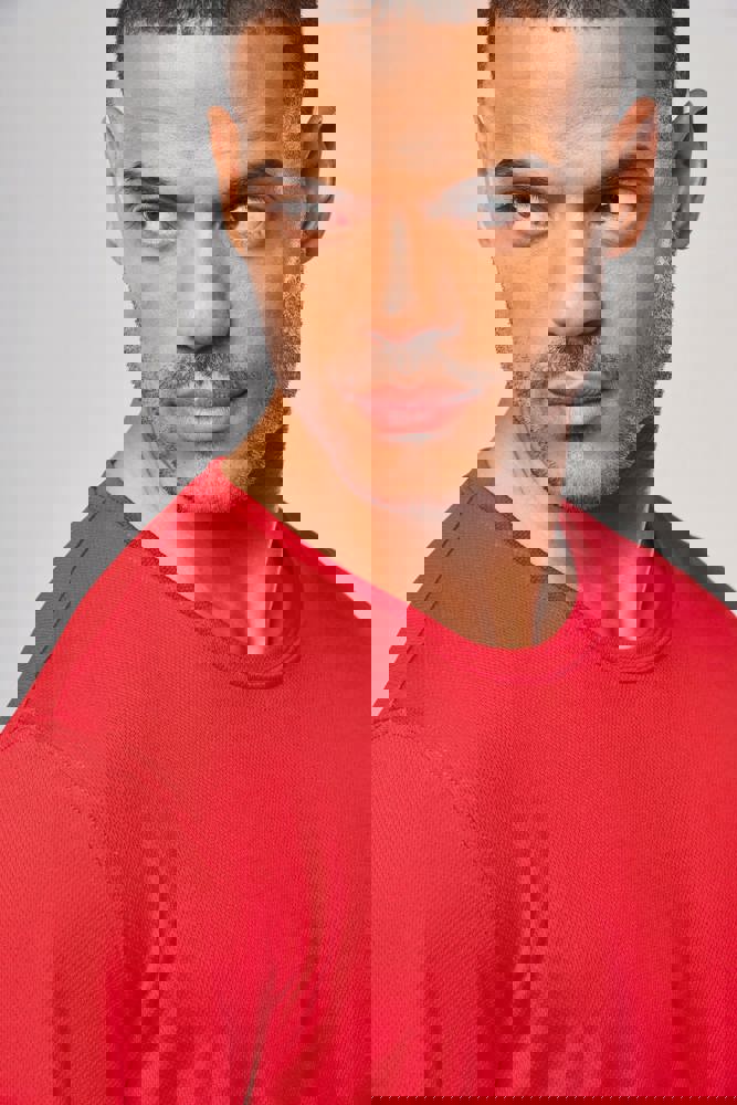 100% polyester. Sneldrogende lichte stof. Ronde hals. Nektape. Afwerking met dubbele stiksels aan de mouwuiteinden en onderkant.