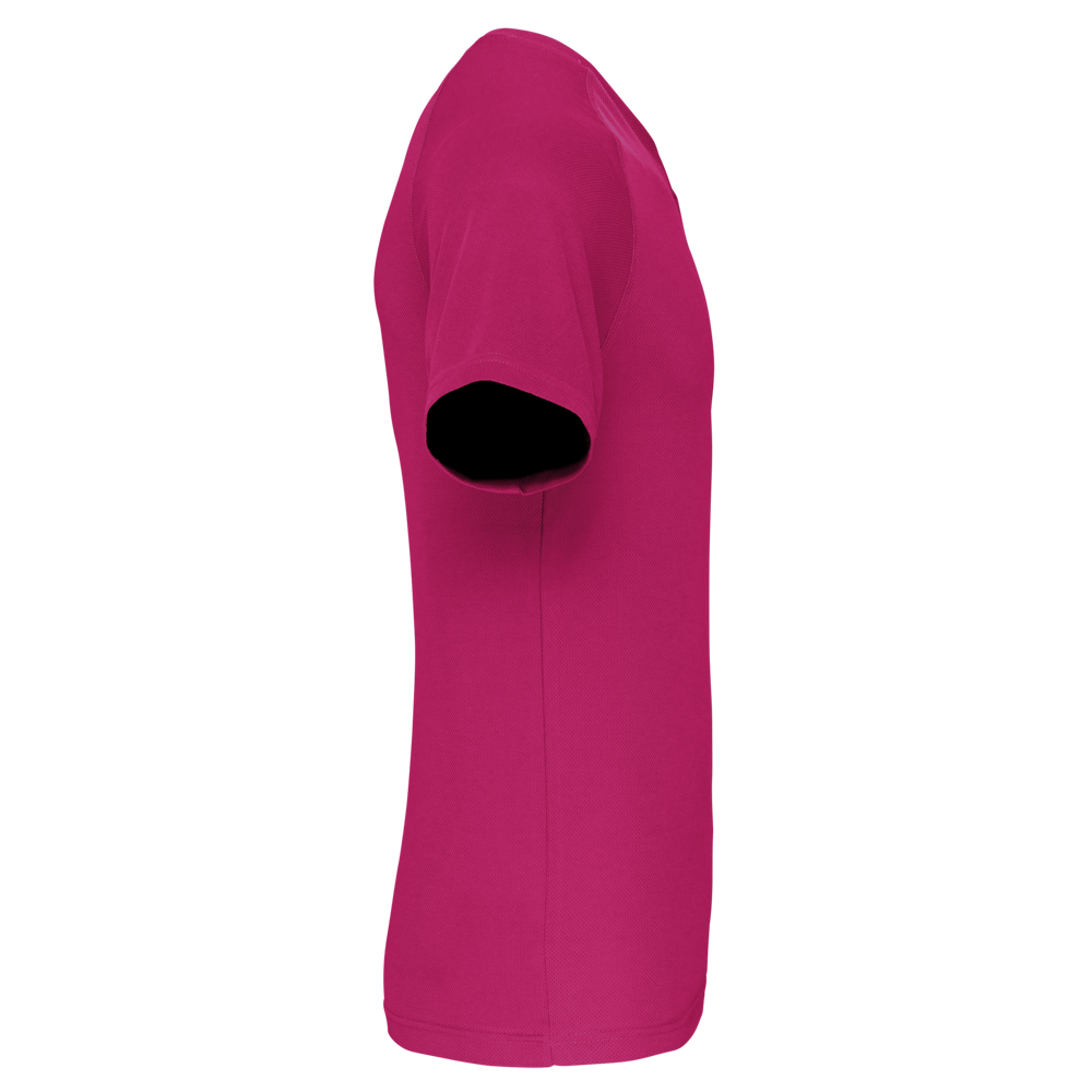 100% polyester. Sneldrogende stof. V-hals met nektape. Raglanmouwen met overlocksteek. Dubbel stiksel aan de mouwuiteinden en onderkant kledingstuk.