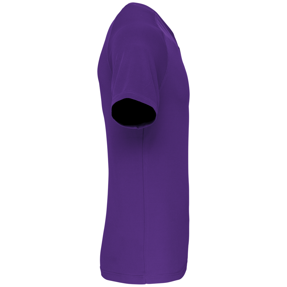 100% polyester. Sneldrogende stof. V-hals met nektape. Raglanmouwen met overlocksteek. Dubbel stiksel aan de mouwuiteinden en onderkant kledingstuk.