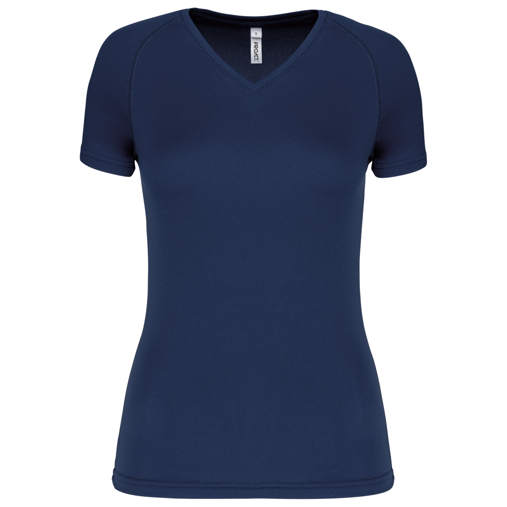 100% polyester. Sneldrogende stof. V-hals met nektape. Raglanmouwen met overlocksteek. Dubbel stiksel aan de mouwuiteinden en onderkant kledingstuk.