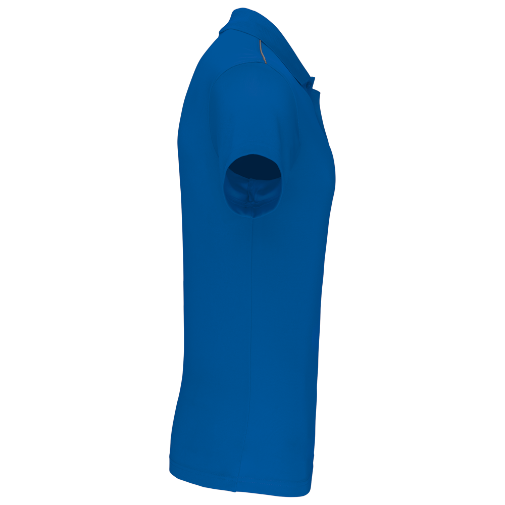 100% polyester interlock. Sneldrogende stof. Kraag in rib. Knooplijst met 3 knopen. Nektape en zijsplitjes in contrastkleur. Contrastkleurige bies op de schouders. Afwerking met dubbele stiksels aan de mouwuiteinden en onderaan.
