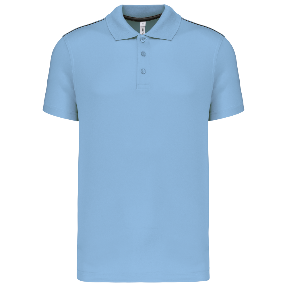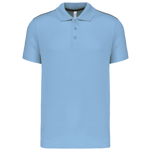 100% polyester interlock. Sneldrogende stof. Kraag in rib. Knooplijst met 3 knopen. Nektape en zijsplitjes in contrastkleur. Contrastkleurige bies op de schouders. Afwerking met dubbele stiksels aan de mouwuiteinden en onderaan.