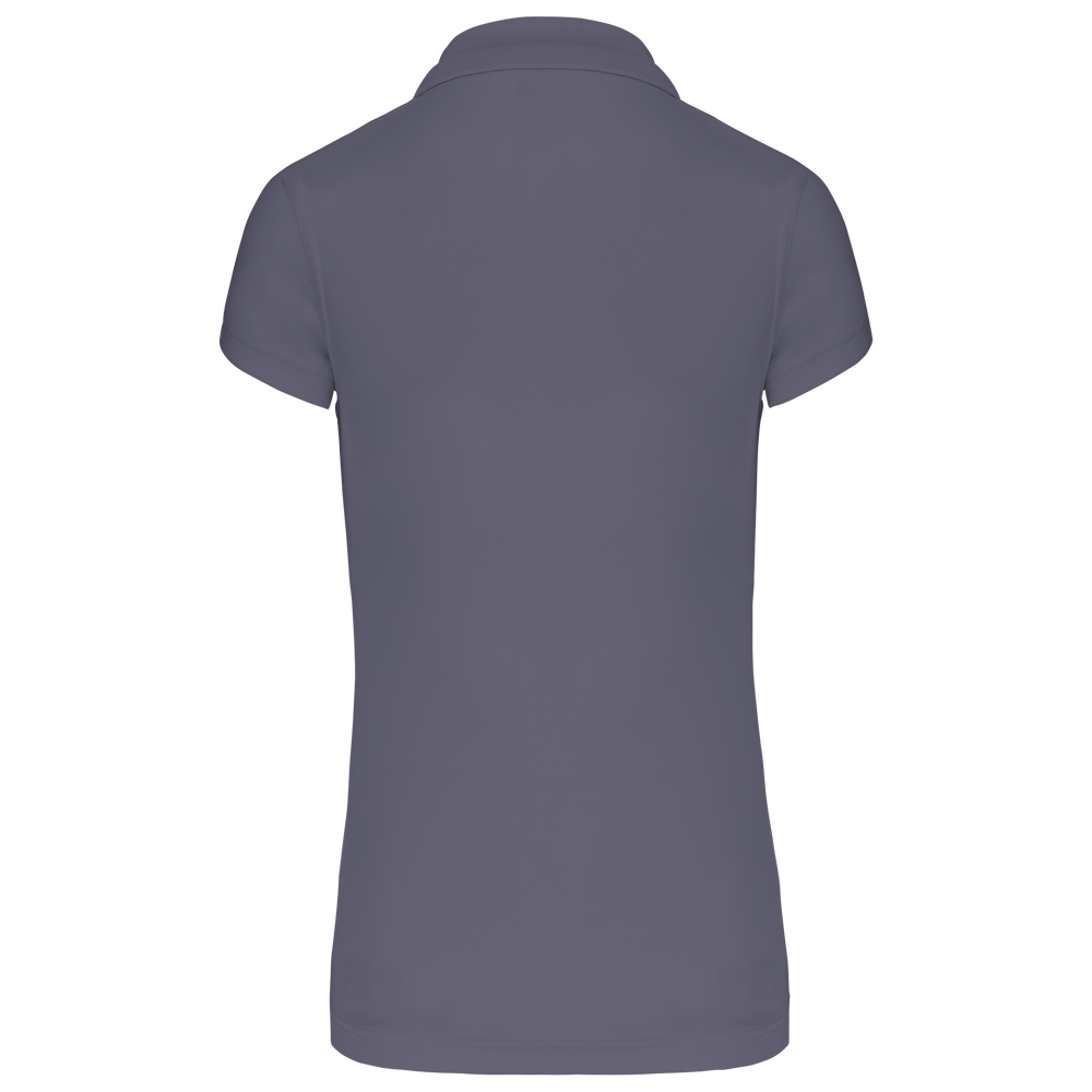 100% polyester interlock. Sneldrogende stof. Kraag in rib. Knooplijst met 3 knopen. Nektape en zijsplitjes in contrastkleur. Contrastkleurige bies op de schouders. Afwerking met dubbele stiksels aan de mouwuiteinden en onderaan.