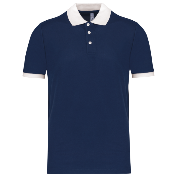 100% piquépolyester Cool Plus®. Rechte snit en moderne look. Kraag en mouwuiteinden in contrasterende ribboord. Knoopsluiting met 3 knopen (contrasterend of effen, afhankelijk van het model). Zijsplitten.