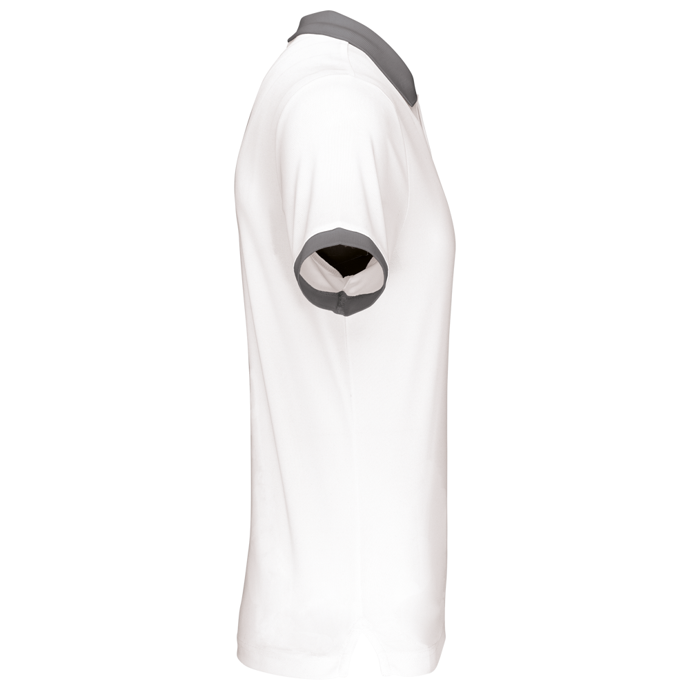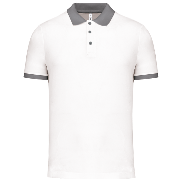 100% piquépolyester Cool Plus®. Rechte snit en moderne look. Kraag en mouwuiteinden in contrasterende ribboord. Knoopsluiting met 3 knopen (contrasterend of effen, afhankelijk van het model). Zijsplitten.