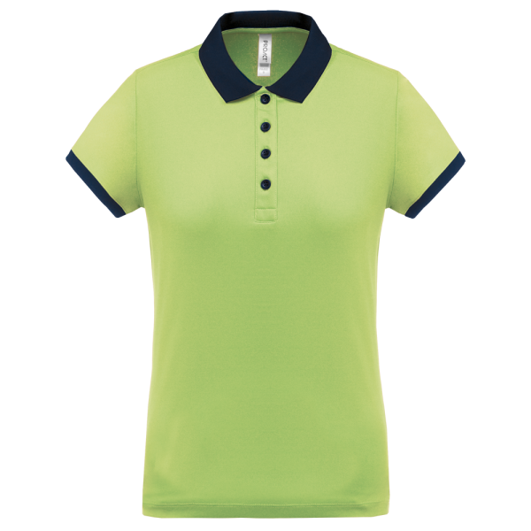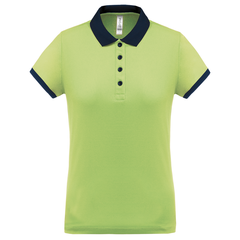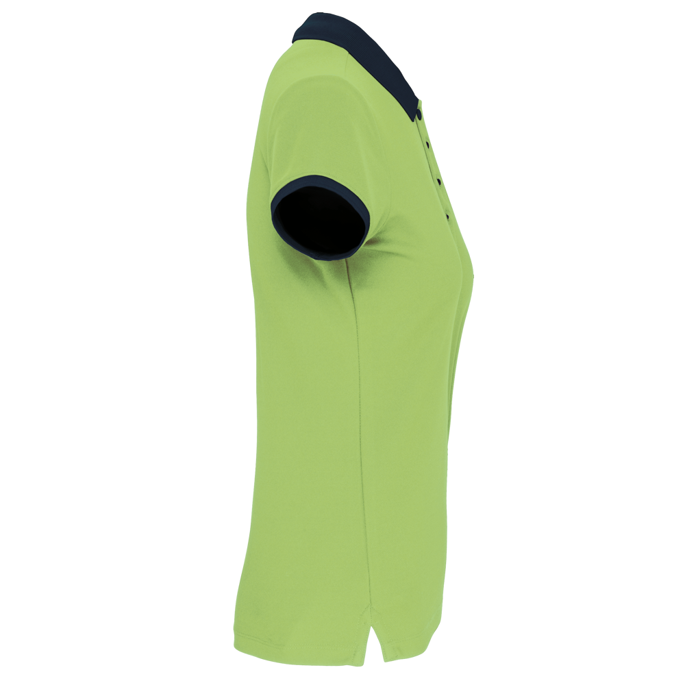 100% piquépolyester Cool Plus®. Getailleerde snit en moderne look. Kraag en mouwuiteinden in contrasterende ribboord. Knoopsluiting met 4 knopen (contrasterend of effen, afhankelijk van het model). Zijsplitten.