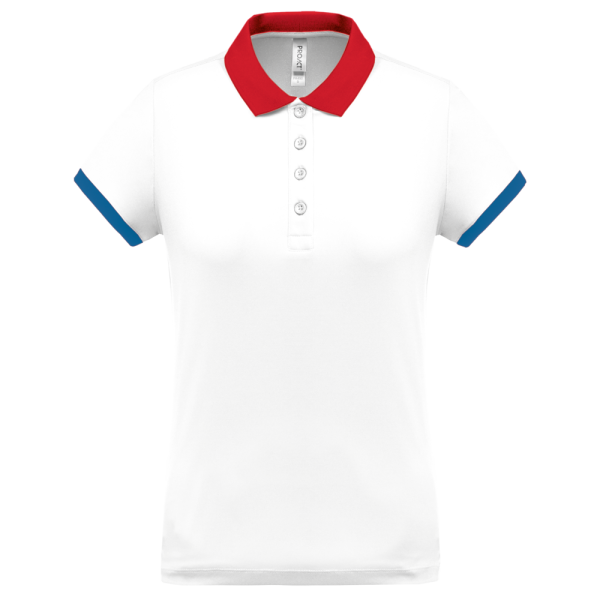 100% piquépolyester Cool Plus®. Getailleerde snit en moderne look. Kraag en mouwuiteinden in contrasterende ribboord. Knoopsluiting met 4 knopen (contrasterend of effen, afhankelijk van het model). Zijsplitten.